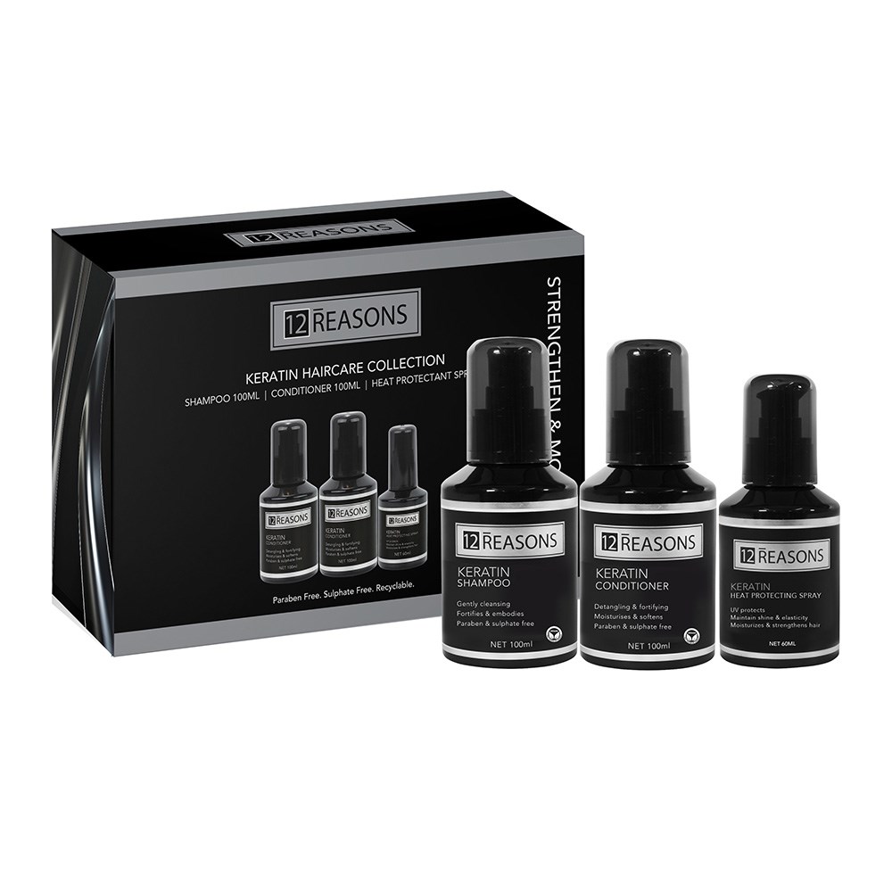 Love travel with 12Reasons! 12Reasons Keratin Travel Pack makes travel beautiful with three travel-sized products. Restore strength and shine while adding softness. Hair is left fortified and repaired. Dry, damaged hair is transformed, shining with nourishment. Enriched with keratin, macadamia oil and avocado oil for the best of nature. Free from parabens and sulphates. Colour-safe. Vegan. Not tested on animals. Designed and formulated in Australia.