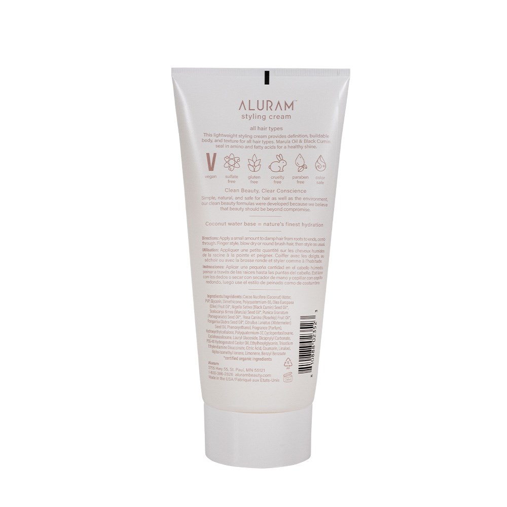 Clean beauty with a clear conscience. Free of formulas which are harmful to hair and the environment. With a powerfully plant-driven formulation started in a base of hydration-rich Coconut Water, Aluram Styling Cream is infused with nourishing Marula Oil for a lightweight styling cream providing definition, buildable body and texture for all hair types. Vegan, sulphate free, gluten free, paraben free and colour safe.