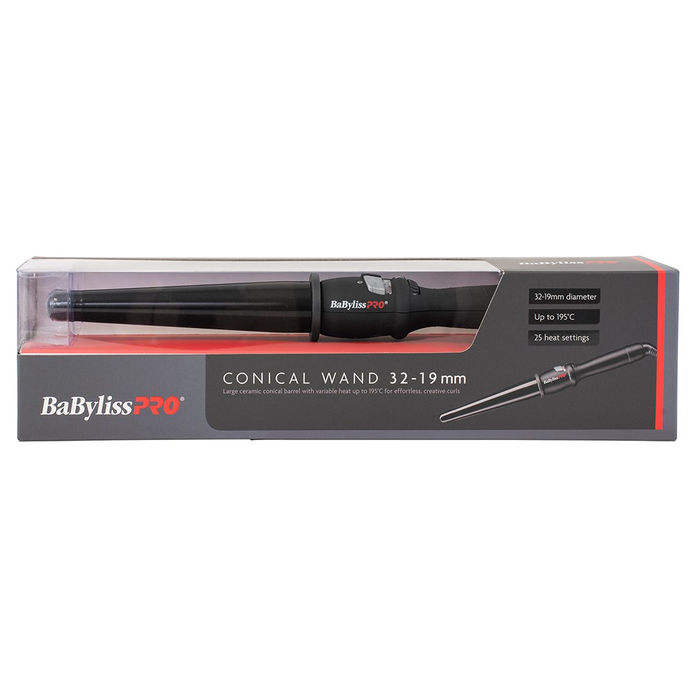 Smooth, shiny and frizz-free curls to covet. BaBylissPRO Ceramic Conical Curling Iron Large creates softer curls and waves with no unsightly kinks. The 19-32mm ceramic conical barrel smooths the hair cuticle for a frizz-free finish, and is ideal for creative, effortless curls. Fast heat up to 195?C and 25 heat settings to adapt to all hairstyles and textures. Safety cool tip creates added control while styling.