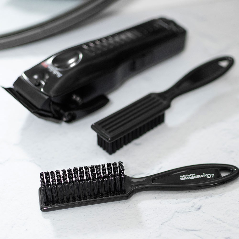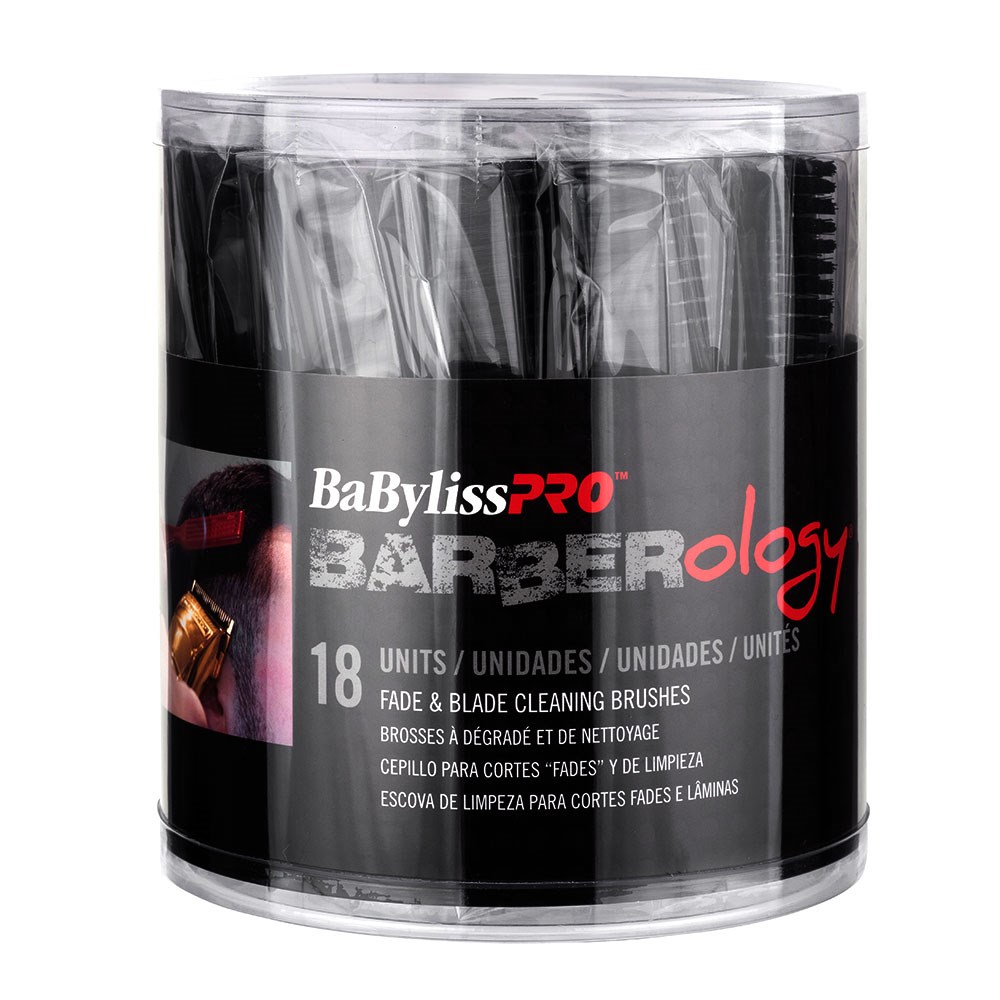 BaBylissPRO Barberology Fade and Blade Cleaning Brushes 18pc Black is ideal for removing excess hair from fade cuts, cutting tools and blades. Soft nylon bristles and a compact, ergonomic design for the left or right hand. Can be sterilised with spray and dried easily.