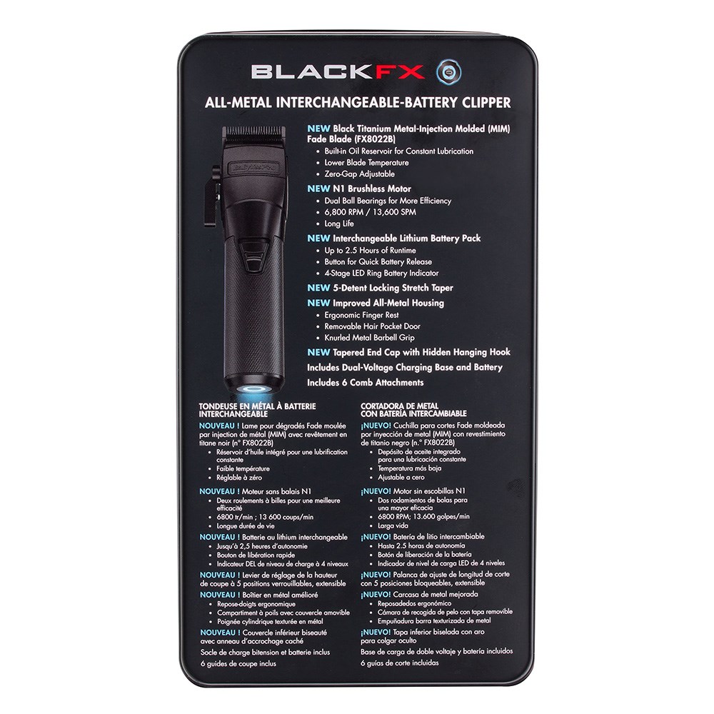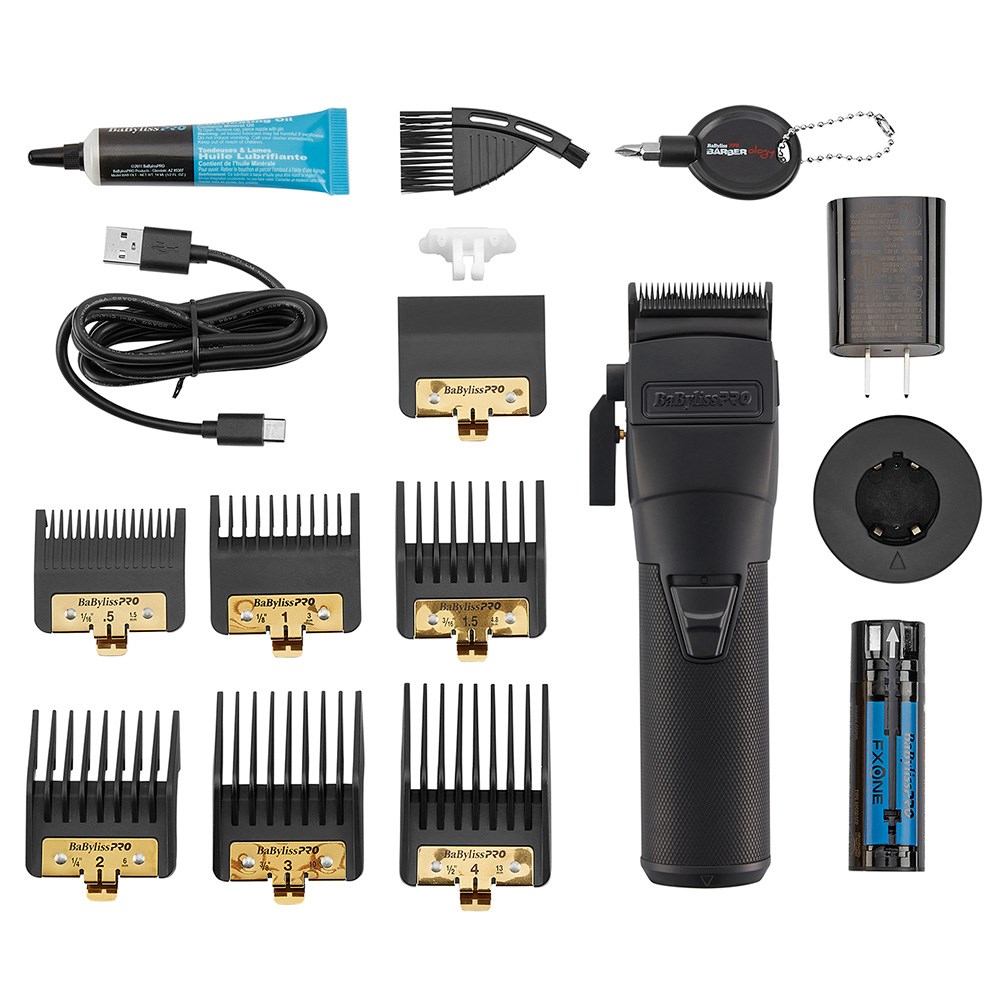 An entire ecosystem of tools based on ONE battery. Change the way you work with BaBylissPRO FXONE BlackFX collection. BaBylissPRO FXONE BlackFX Hair Clipper is a professional, all metal clipper with a replaceable and interchangeable lithium battery pack. Quick battery release button and up to 2.5 hours of runtime. New N1 6,800 rpm brushless motor delivers exceptional efficiency. New black ultra-thin Metal Injection Moulding (MIM) blade with oil reservoir for constant lubrication. Zero gap adjustable. New 5-detent locking stretch taper. Check out BaBylissPRO FXONE BlackFX Hair Trimmer and Double Foil Shaver, all compatible with the same battery. A revolution in efficiency!