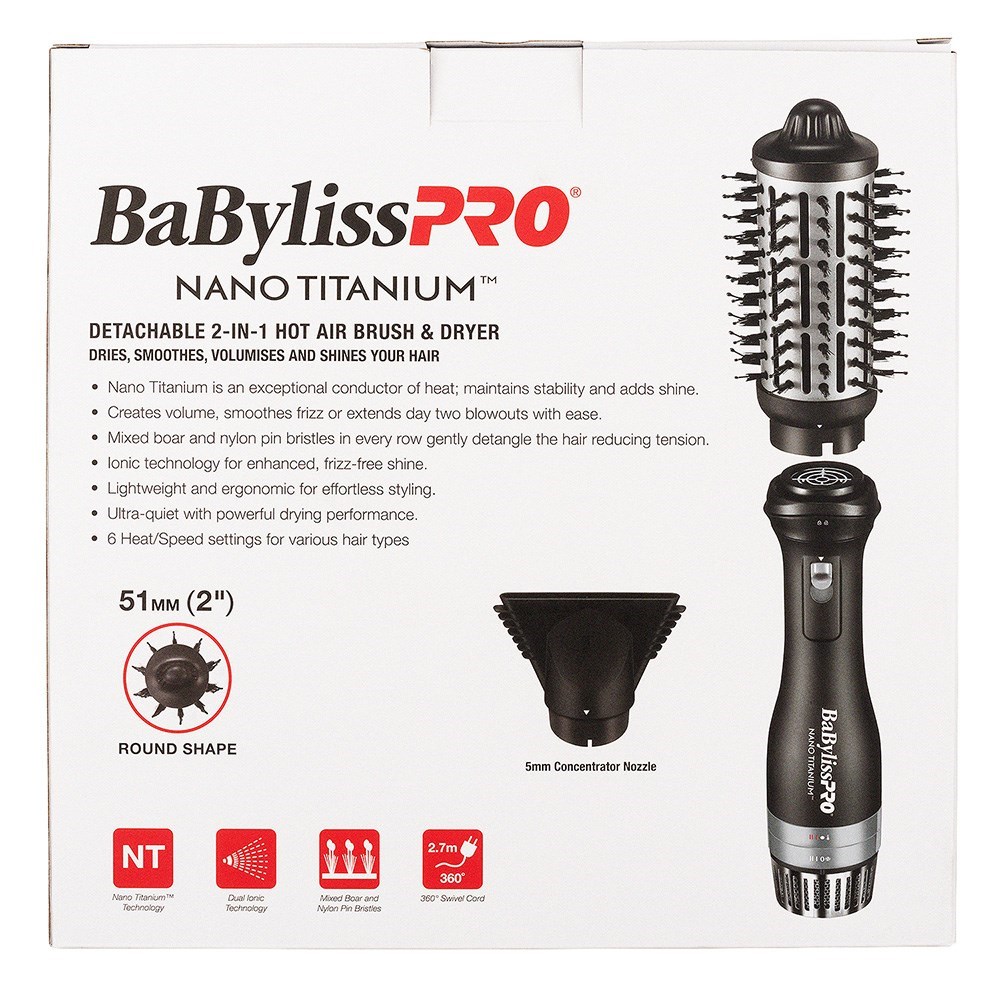Dry, smooth, volumise and add shine… with one tool! Styling doesn’t get simpler than BaBylissPRO Nano Titanium Detachable 2-in-1 Hot Air Brush and Dryer. With detachable hairdryer head and hot air brush head, switch it up and style it up. Lightweight, ergonomic and ultra-quiet to make blow-dries a breeze. BaByliss PRO dual ionic technology with 2 ion emitters creates twice the ions for maximum smoothness and shine for styling flexibility. 6 heat/speed settings for all hair types. Larger 51mm barrel ensures beautiful volume and bouncy movement. Mixed boar and nylon pin bristles gently detangle.