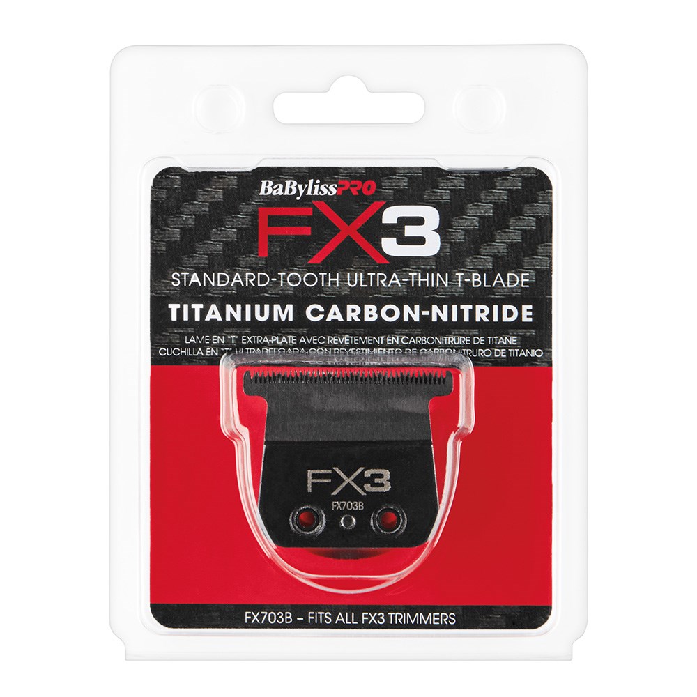 Grooming excellence with BaBylissPRO Replacement FX3 Hair Trimmer T Blade FX703B. This titanium carbon-nitride T-blade is designed to fit BaByliss PRO FX3 Hair Trimmer only. Standard tooth, ultra-thin T-blade for precise, clean cuts.
