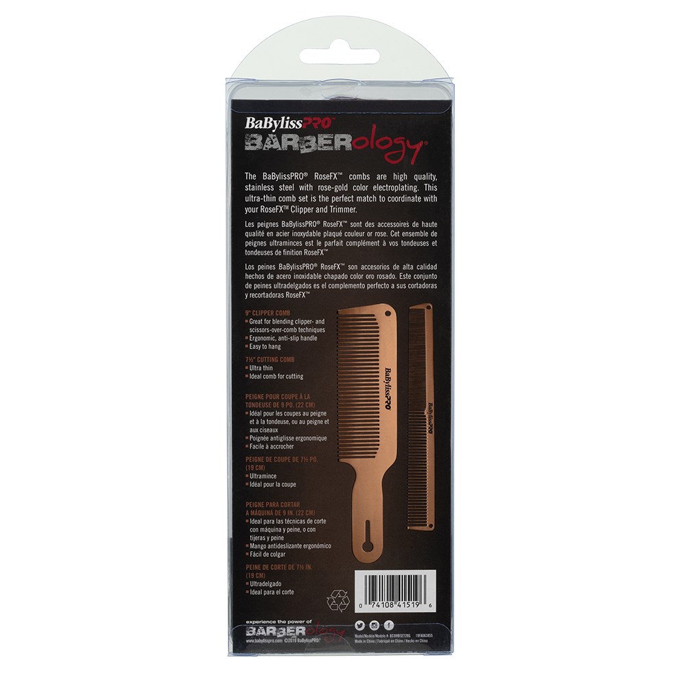 Essential combs for every barber. Designed to complement BaBylissPRO RoseFX clipper, trimmer and shaver, BaBylissPRO RoseFX Metal Comb Set is a stylish set of must-haves. The barbering combs are made from high quality stainless steel with rose gold colour electroplating. Cutting comb is a great all-purpose comb for haircutting, while clipper comb is perfectly suited to clipper-over-comb and scissor-over-comb techniques. Easy to hang, the ultra-thin combs are ergonomic with anti-slip handles.