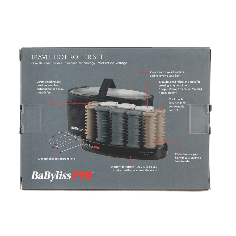 Let’s travel in style! Meet the BaBylissPRO Travel Hot Roller Set, a 10 piece multi-sized hot roller set offering everything you need for fast and easy curls, waves and volume on-the-go. With 10 rollers in 3 sizes, silky smooth results are a given courtesy of Ceramic Titanium Technology which heats quickly and evenly. Dual voltage hair curlers for worldwide usage.