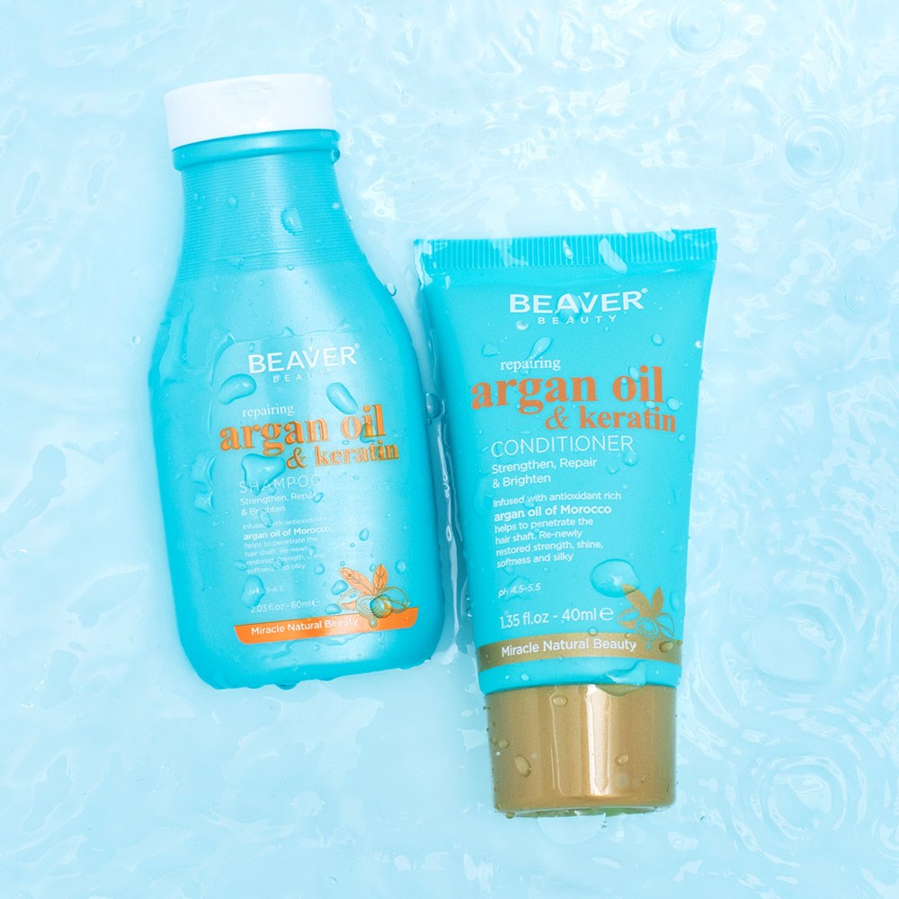 The power of nourishing, antioxidant-rich argan oil and strengthening keratin. Beaver Argan Oil and Keratin Repairing Shampoo 60ml penetrates the hair shaft to plump up the hair cuticle from the inside out. Enjoy newly restored strength, shine and silky softness. This lightweight yet ultra-moisturising formula gently cleanses hair without drying it out, revealing renewed vibrancy. A colour-safe shampoo free from sulphates and parabens.