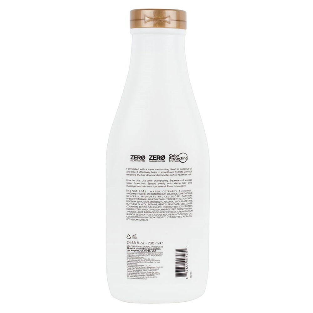 Hydrate, strengthen and repair. Formulated with a super moisturising blend of coconut oil and quinoa seed extract, Beaver Coconut Oil and Quinoa Moisturising Conditioner deeply hydrates without weighing hair down. The addition of coconut oil and quinoa seed extract helps repair, soften and revive. Smooths and protects hair. Colour-safe formula free from sulphates and parabens.