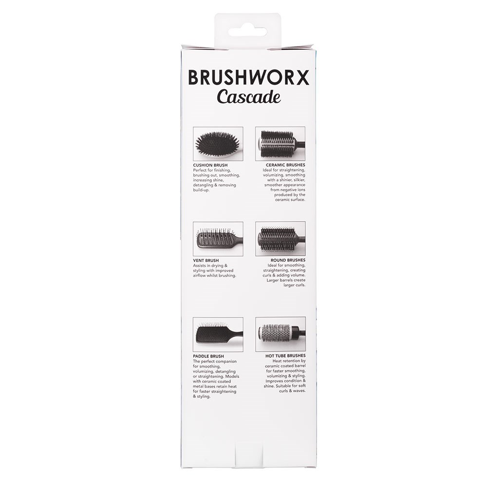 Speed up your blow-drying time! Brushworx Cascade Thermal Paddle Hair Brush takes a salon essential and makes it even better. More comfortable, more lightweight and more balanced. With the purpose of retaining heat, this ceramic coated paddle brush is designed to dry and style faster. A texturised, rubberised handle improves grip and control. Ideal for blow-drying to smooth and straighten hair, as well as detangling. Brushworx is proudly Australian-owned.