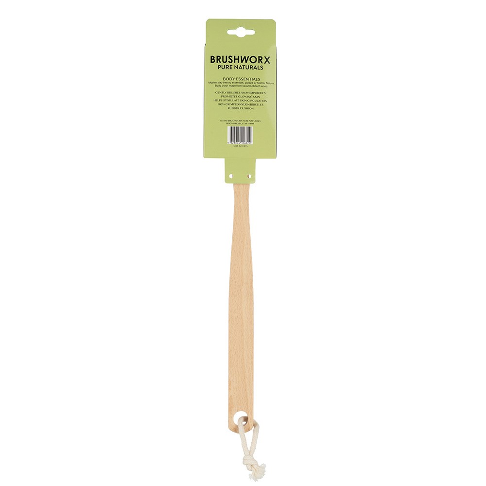 A modern day beauty essential, guided by Mother Nature. Brushworx Pure Naturals Body Brush with Long Handle is a beautiful beechwood body speciality brush with 100% crimped nylon bristles. Use as a dry brush before showering. Gently exfoliate to reveal brighter, smoother skin. Boost circulation with a gentle massage. Promote glowing skin by washing away impurities. Prepare the skin to better absorb body moisturisers or to ensure even and consistent tan application.