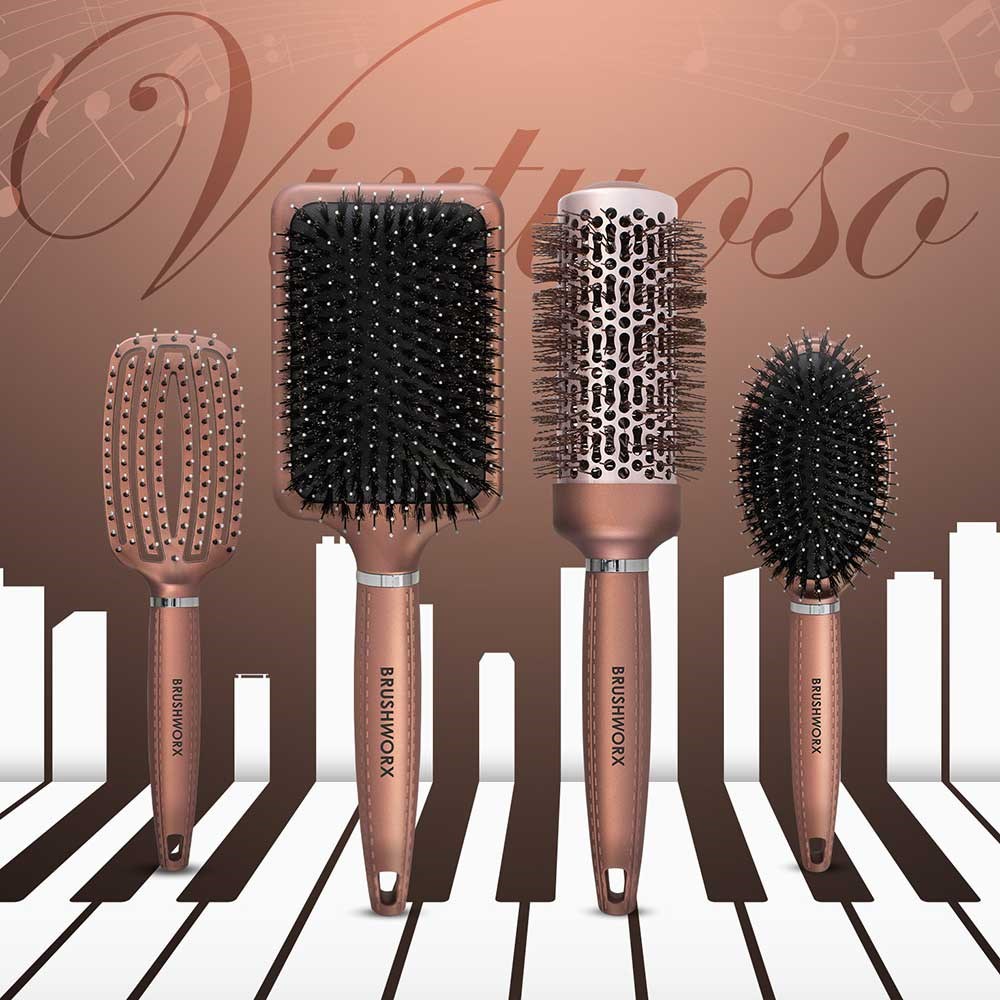 A Virtuoso of the hairstyling world. With beautiful rose gold finish, the Brushworx Virtuoso range enhances smoothness, silkiness and shine. Speed up drying time with the 7 row Brushworx Virtuoso Vent Brush, designed to optimise airflow during styling and brushing. Gentle nylon bristles suit all hair types. Lightweight, comfortable handle.
