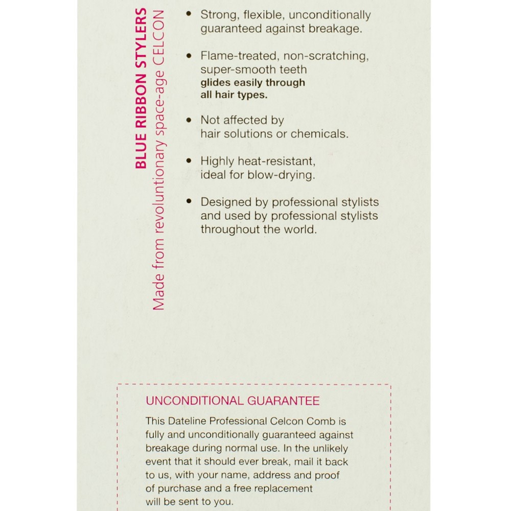 The Blue Celcon Basin Comb provides professional performance at a fraction of the cost! This Dateline Professional heat-resistant, strong and flexible comb has super-smooth teeth to ensure no snagging or pulling. Features wide teeth for detangling and combing wet hair. Length: 20cm