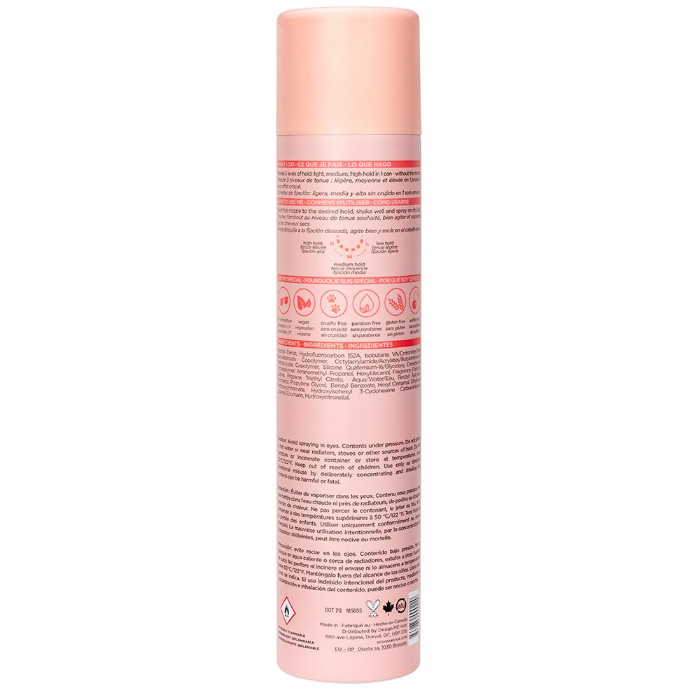 Three levels of hold in one can. DesignME Hold.ME Three-Way Hairspray provides three levels of hold, light, medium and high, without the crunch. Twist the nozzle for your desired hold and spray away. Light hold is perfect for prepping and flyaways, medium hold is ideal for flexible yet long-lasting hold, high hold is great for locking in your look. Why this product is special: vegan, cruelty-free, paraben-free, gluten-free, sulphate-free and made in Canada.
