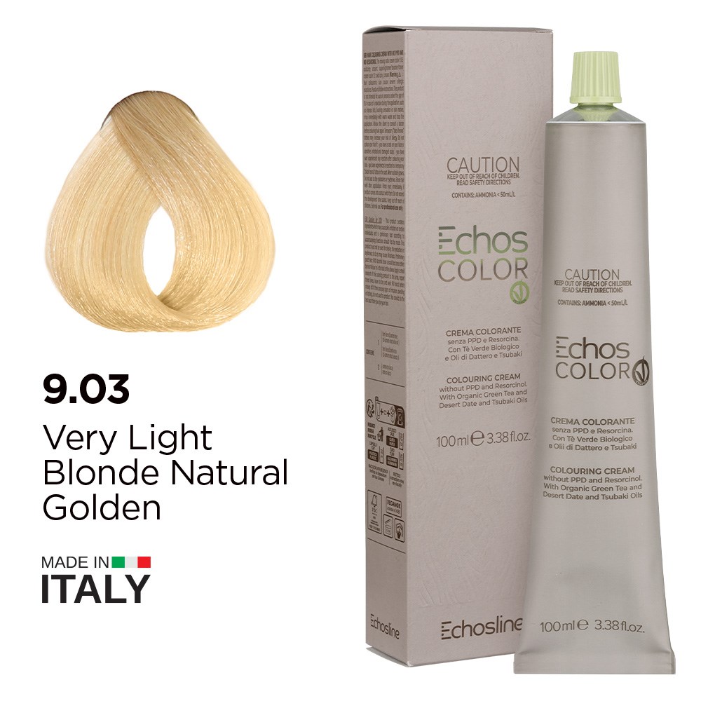 Incredible depth and longevity with reduced impact. Echos Color Vegan Hair Colour 9.03 Very Light Blonde Natural Golden respects professionals, consumers and the environment. This 100% vegan colouring cream is formulated without paraphenylenediamine (PPD) and resorcinol. Rich, long-lasting permanent hair colour boosted by green tea extract for longevity, desert date oil for revitalisation and tsubaki oil for shine. Made in Italy, this is elite hair colour turned vegan.