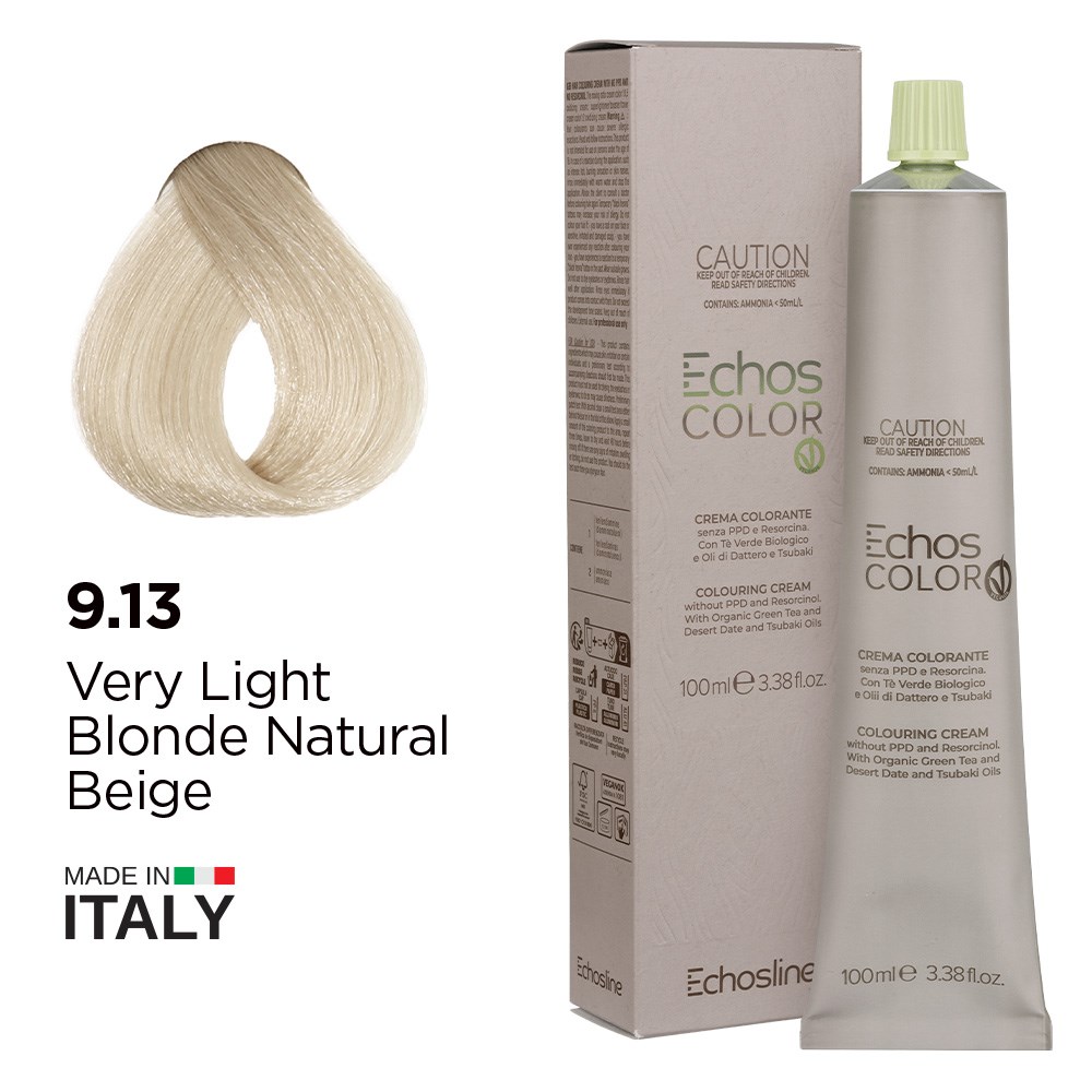 Incredible depth and longevity with reduced impact. Echos Color Vegan Hair Colour 9.13 Very Light Blonde Natural Beige respects professionals, consumers and the environment. This 100% vegan colouring cream is formulated without paraphenylenediamine (PPD) and resorcinol. Rich, long-lasting permanent hair colour boosted by green tea extract for longevity, desert date oil for revitalisation and tsubaki oil for shine. Made in Italy, this is elite hair colour turned vegan.