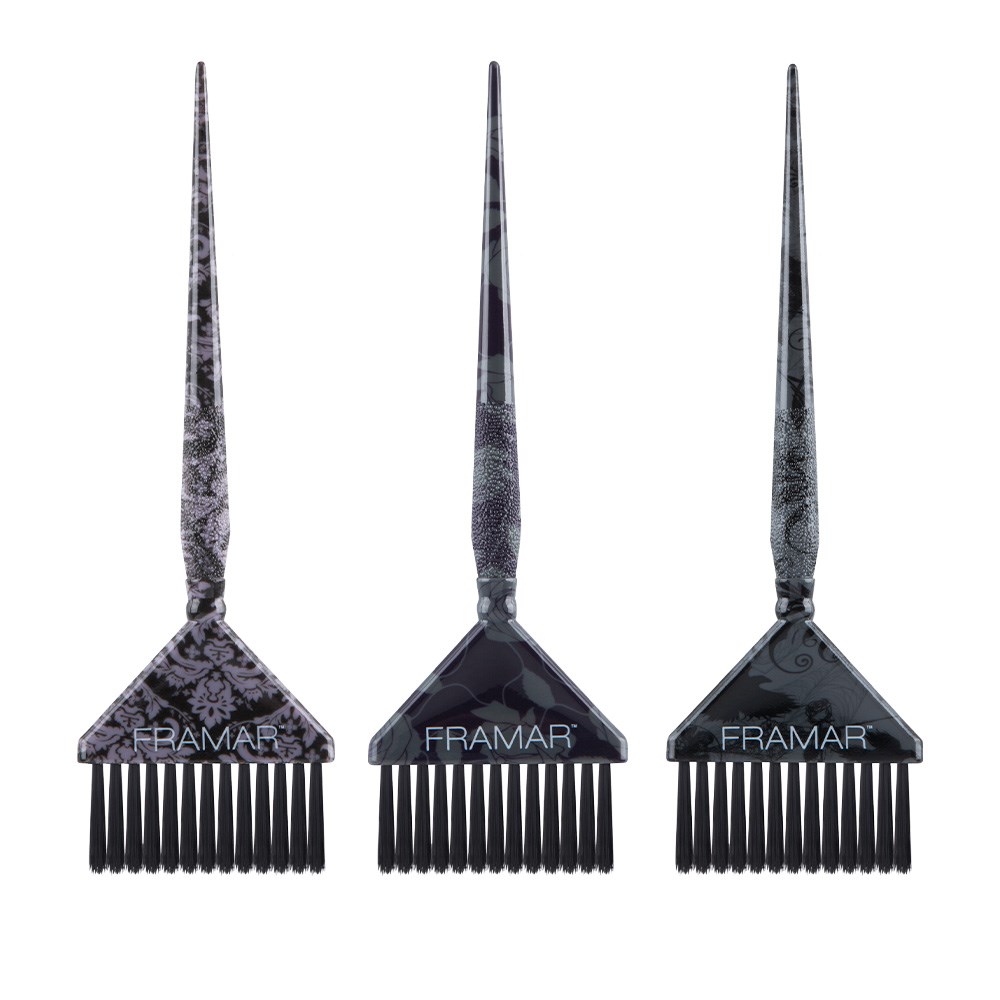 It’s not just a phase! With hauntingly beautiful goth aesthetics, Framar Big Daddy Tint Brush Set Oh My Goth embraces the dark side. Set includes three brushes with Framar’s famous AccuSoft bristles which are tapered to pick up and distribute colour to hair evenly, quickly and precisely. The wide brush head is designed for all over dye jobs and root tapping while still being comfortable in your hand.