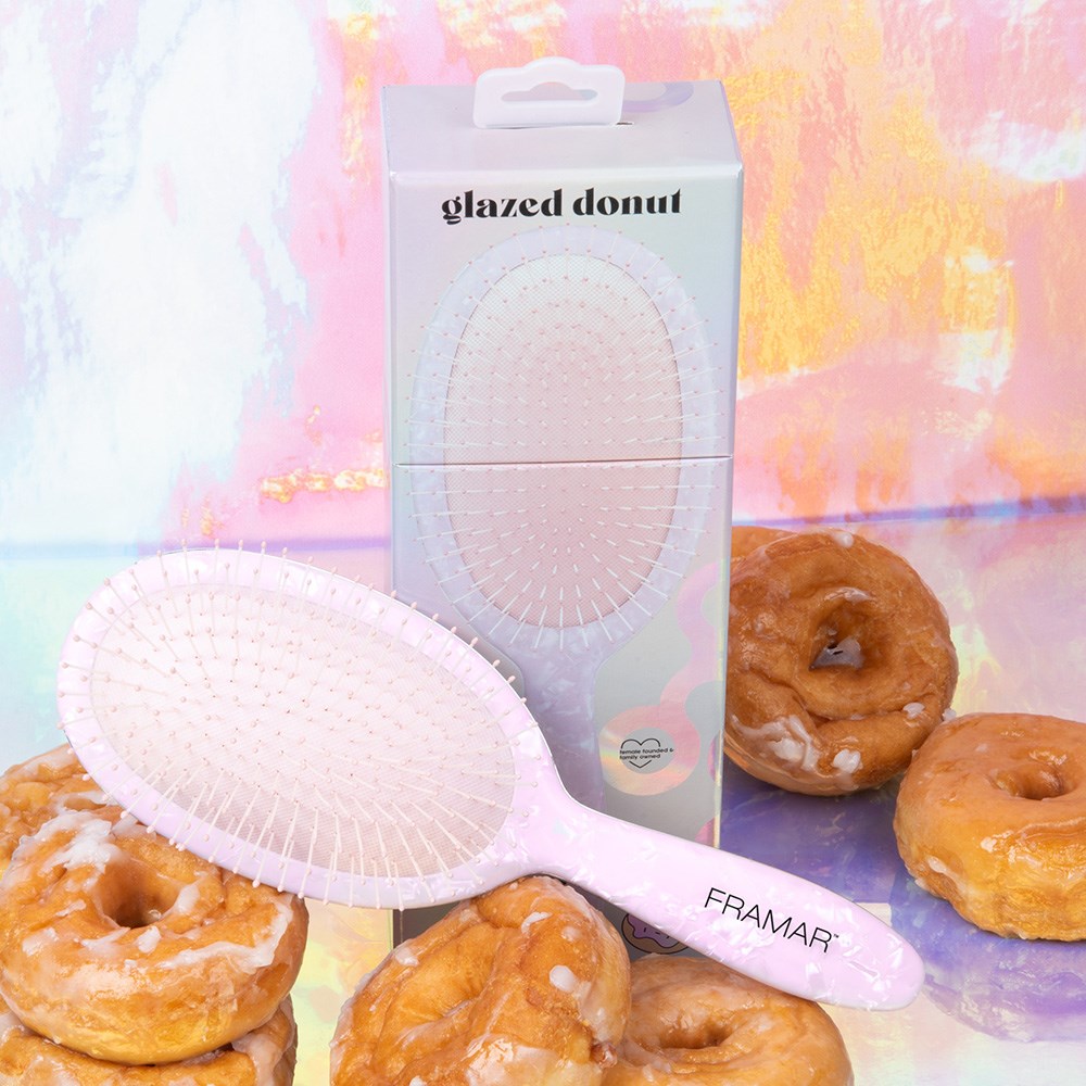 Prettiest pearlescent! With dreamy, soft tones, Framar Detangle Hair Brush Glazed Donut is your new favourite. Effortlessly detangle wet or dry hair with ease. Ideal for all hair types, including wigs and hair extensions. Flexible bristles deliver pain-free brushing. Not only a detangler, this brush is also great at brushing colour or toner through hair for even application or assist in styling, such as brushing out curls.