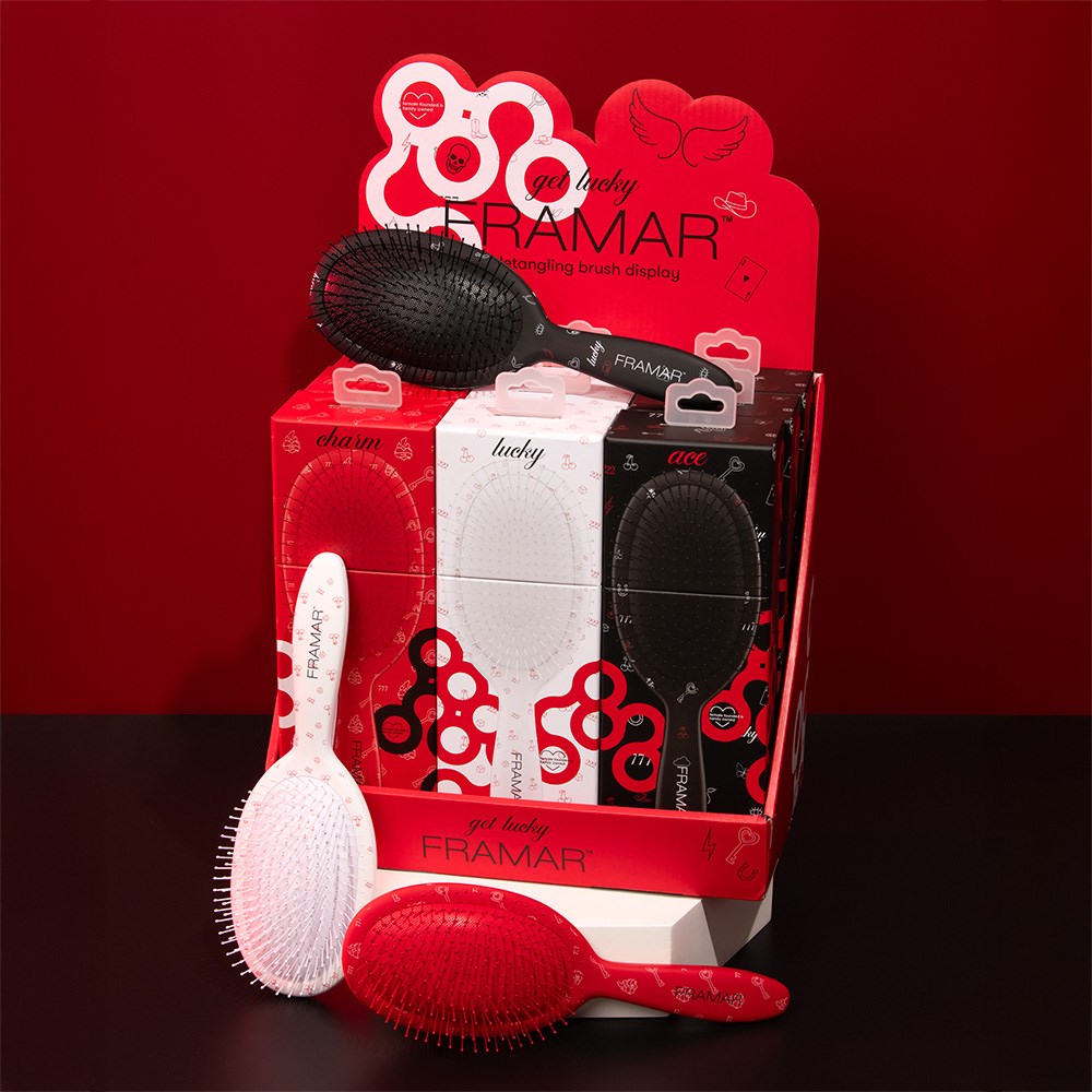 Your lucky charms for detangling! Framar Detangler Hair Brush Display 9pc Get Lucky features 9 brushes in Black, White, and Red. Each brush effortlessly detangles wet or dry hair with ease. Ideal for all hair types, including wigs and hair extensions. Flexible bristles deliver pain-free brushing. Not only a detangler, these hair brushes are also great at brushing colour or toner through hair for even application or assist in styling, such as brushing out curls. Retail display is ideal for counters and shelves.