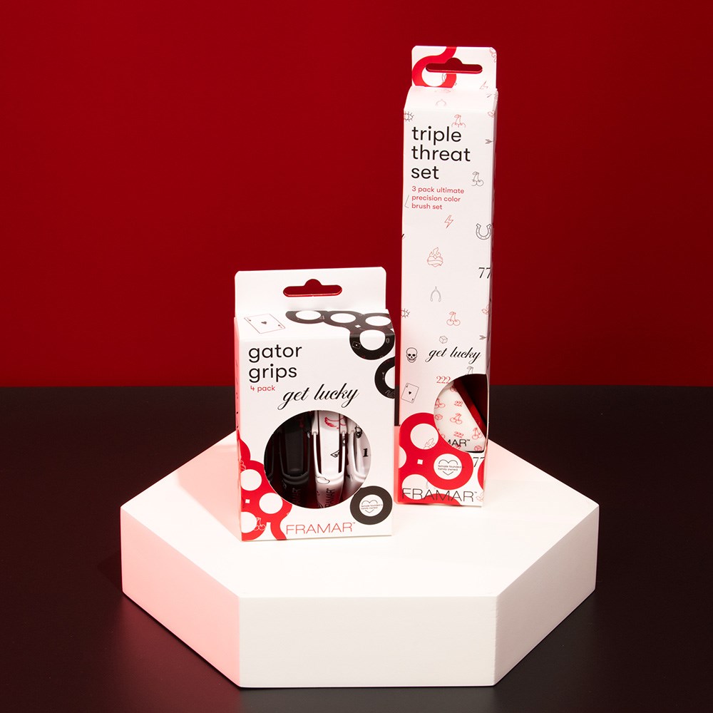 Your lucky charms! Get lucky with Framar’s good luck charm print. Framar Gator Grip Clips 4 Pack in Get Lucky effortlessly hold large sections of hair. With a wide mouth and rubberised non-slip surface, these clips are stronger than an alligator. Secures hair during colouring, styling and foiling. Industrial springs for ultimate durability. Pack of four: two black clips, two white clips.