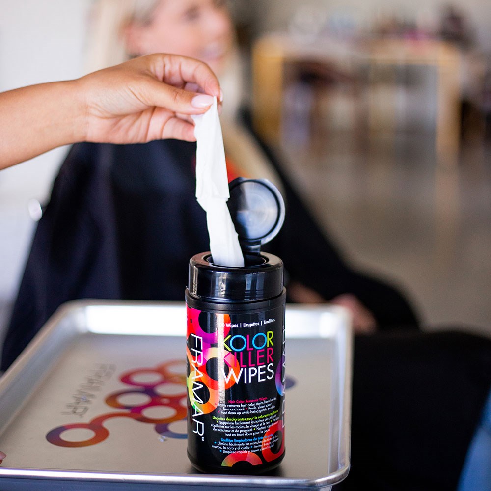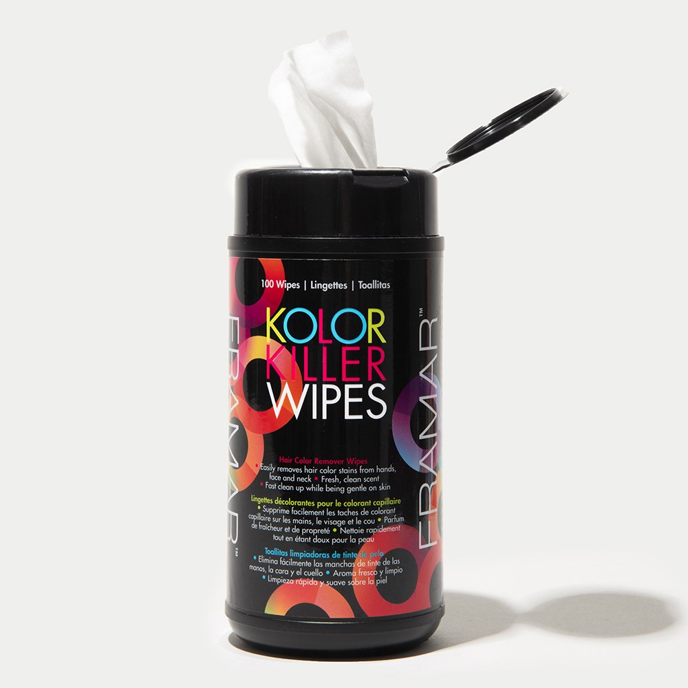 These wipes are worth the hype! Pop the top, grab a wipe and say good riddance to stubborn dye stains with Framar Kolor Killer Wipes. These convenient wipes easily remove hair colour stains from hands, neck and face and are a must have in your collection of hair colouring accessories. The fresh, clean scent leaves you and your client smelling great. Perfect for cleanup on all skin types. 100 wipes per easy access, popup top container.