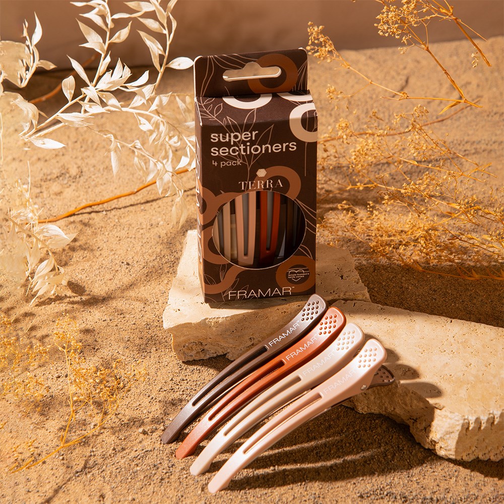 Effortlessly section hair without creasing or denting. Framar Super Sectioner Clips 4pk Terra Neutrals allow for seamless styling with every service. Strong but comfortable grip with cushion compression. Self-locking mechanism with silicone strip to keep hair in place without creasing. Chemical resistant material. Four pack in neutrals.