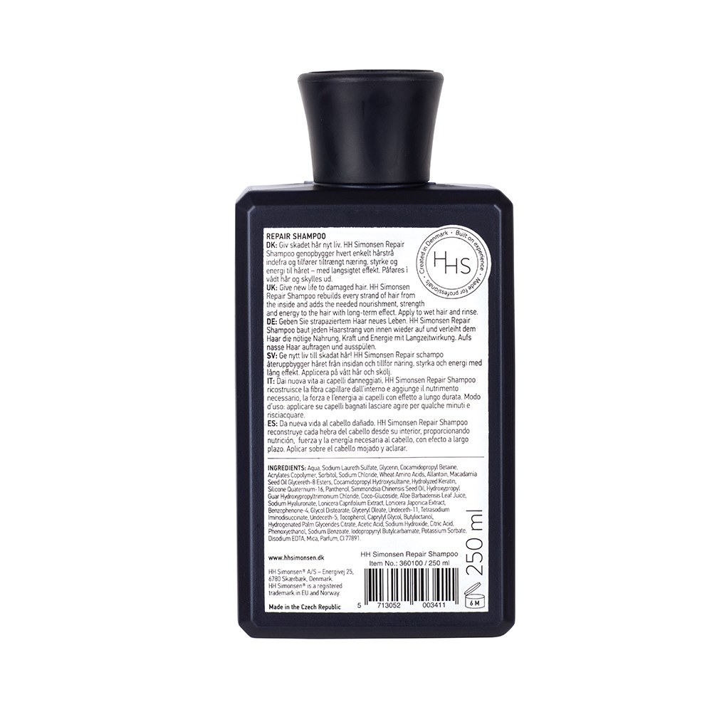 Immediate emergency help for damaged hair. HH Simonsen Repair Shampoo contains several keratin-rich micro-proteins which deeply penetrate the hair strand to strengthen hair from within. Wheat-based amino acids, macadamia oil and jojoba oil add nourishment, vitality and strength. This is a luxury shampoo which will revitalise tired hair. Created in Denmark. Built on experience. Made for professionals.