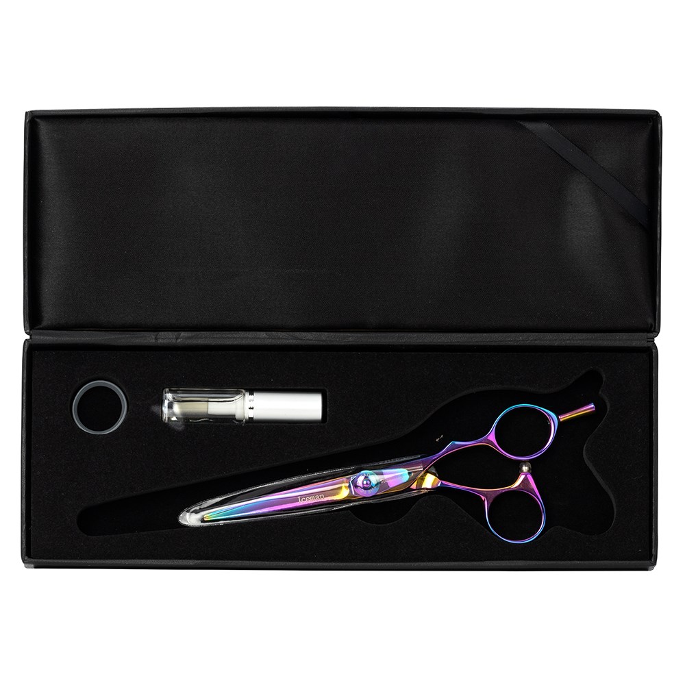 Unleash your imagination and cutting creativity with Iceman Suntachi Rainbow – where vibrant style and traditional craftsmanship meet. The light reflective rainbow finish transforms with striking shades of pink, green, purple, orange, blue and gold… for scissors which scream “WOW”!