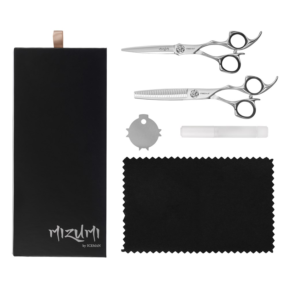 When precision is everything, compromise isn’t an option. Mizumi by Iceman Katani 6” Hairdressing Scissors and Thinner Set Silver is a celebration of Japanese-inspired craftsmanship, designed for hair professionals who demand the best. Meticulously forged from VG10 steel, enriched with cobalt and high carbon content, this set delivers unparalleled sharpness, exceptional durability and superior corrosion resistance. Includes 6” hairdressing scissors and hairdressing thinner with 28 teeth.