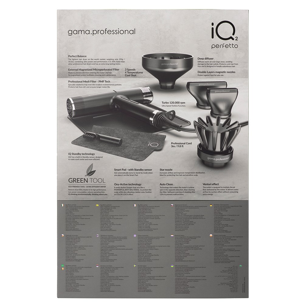 The evolution of the hair dryer revolution. iQ2 Perfetto Hair Dryer Black by GA.MA Professional is the lightest, most powerful and most technologically advanced hair dryer in history. Welcome the new era of hair dryers with an ultra-efficient 110,000 rpm BLDC motor. New turbo boost function increases performance to an incredible 120,000 rpm! Almost half the weight of a standard hair dryer, this extremely lightweight 294g hair dryer features new design features for the most amazing blow-drying experience ever, including new antibacterial technology, new nozzle, new standby technology, redesigned rear filter system and more. This is the future of hair drying.