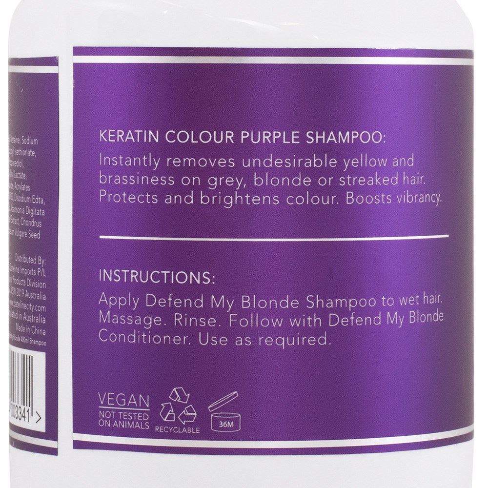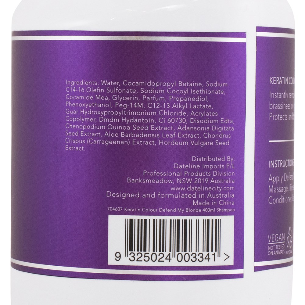 Help blondes get maximum colour defence with nourishing keratin. Keratin Colour Defend My Blonde Shampoo is the essential cleanser to maintain rich, vibrant hair blonde between salon appointments. Instantly removes unwanted yellow and brassy tones on grey, blonde and highlighted hair. Blonde is left bright, vibrant and protected against fade. Sulphate and paraben-free.