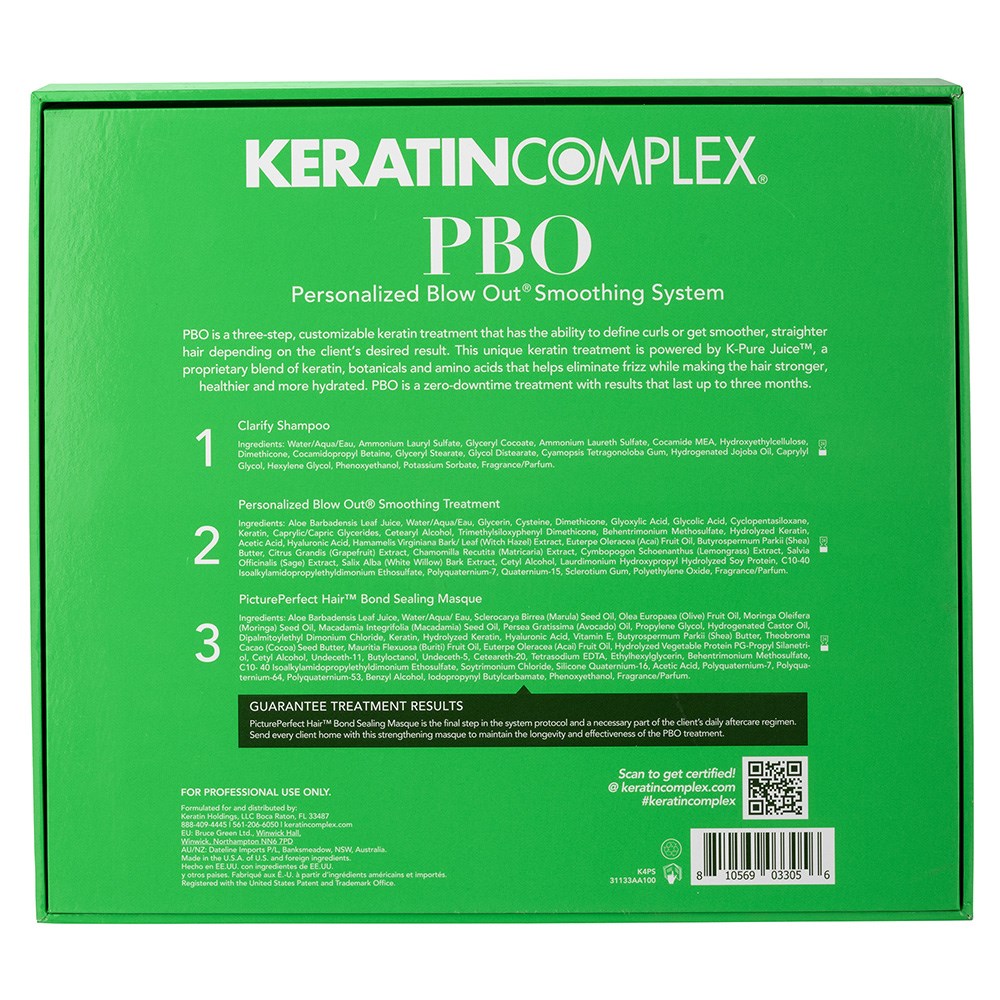 Keratin Complex Personalised Blow Out (PBO) Smoothing System is a three-step, customisable keratin hair straightening treatment with the ability to control frizz and maximise smooth for up to three months. Define curls or get smoother, straighter hair depending on your client’s desired result. This unique keratin treatment is powered by K-Pure Juice, a proprietary blend of keratin, botanicals and amino acids, which eliminates frizz while leaving hair stronger, shinier and hydrated. Keratin Complex Personalised Blow Out Smoothing System is a zero downtime treatment for same-day styling.