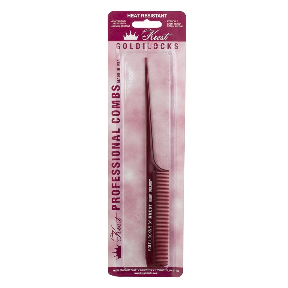 Crafted with precision and durability, the Krest Goldilocks No. 5 Tail Comb is an essential tool for professional stylists and at-home hair enthusiasts alike. Measuring 21.5 cm, this lightweight yet sturdy comb features a long, pointed tail ideal for sectioning, parting, and styling with accuracy. Made from DuPont Delrin, the Goldilocks No. 5 is heat and chemical-resistant, making it perfect for use with hot tools and during colouring or chemical treatments. The finely spaced teeth glide smoothly through all hair types, helping you achieve sleek, precise looks with ease.