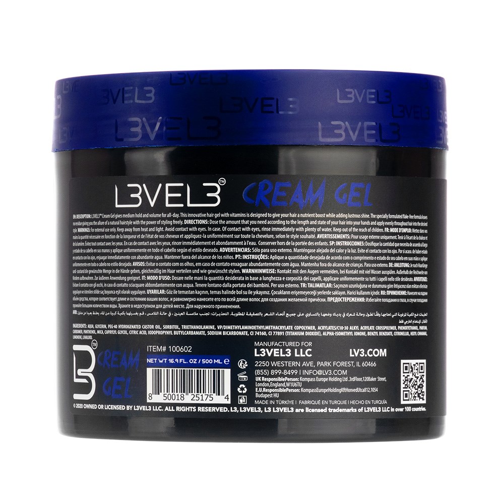 Level up. L3VEL3 Cream Hair Gel 1L stands out for its ability to nourish and protect hair while providing perfect hold and shine. The vitamin B5-enriched formula helps boost hair texture, enhance volume and deliver medium hold without flakes or residue. Whether shaping a classic, polished style or adding definition to curls, this cream gel gives the flexibility, control and shine you crave. LEVEL 3 is by the artist for the artist, aiming to reinvent the barbering industry with high calibre products without the high price. Men’s haircare and grooming designed to shake up the industry.