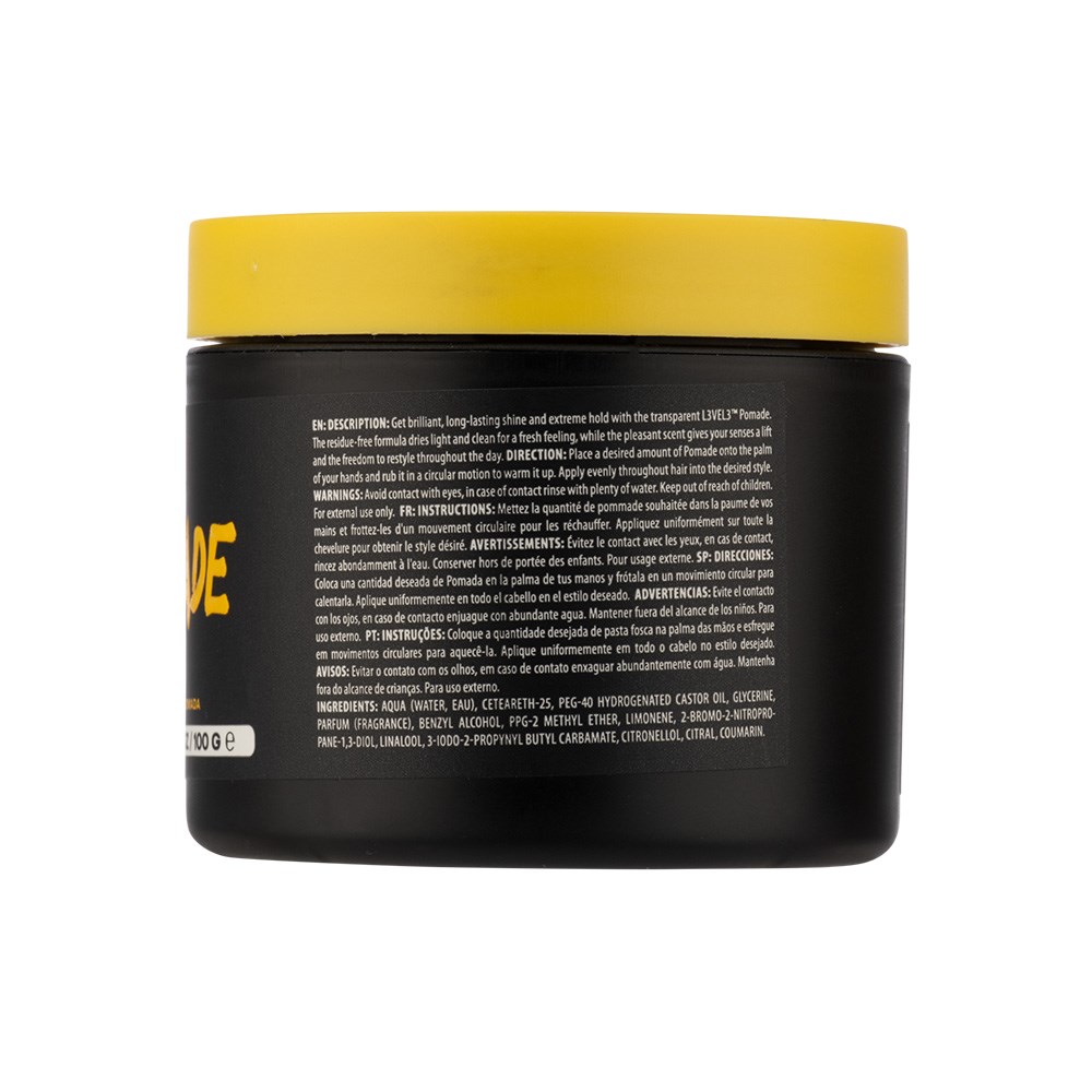 Level up. L3VEL3 Hair Styling Pomade 100g upgrades any style with brilliant shine and long-lasting hold. This lightweight yet nutrient-rich pomade is a clear formula which provides strong hold without stickiness, enhancing both shine and volume. Designed to nourish hair, it helps improve resilience against damage while securing your style. A high level of control for all hair types without weighing hair down. Smooth, defined hair with glossy shine and no frizz. Water-based to wash out effortlessly. LEVEL 3 is by the artist for the artist, aiming to reinvent the barbering industry with high calibre products without the high price.