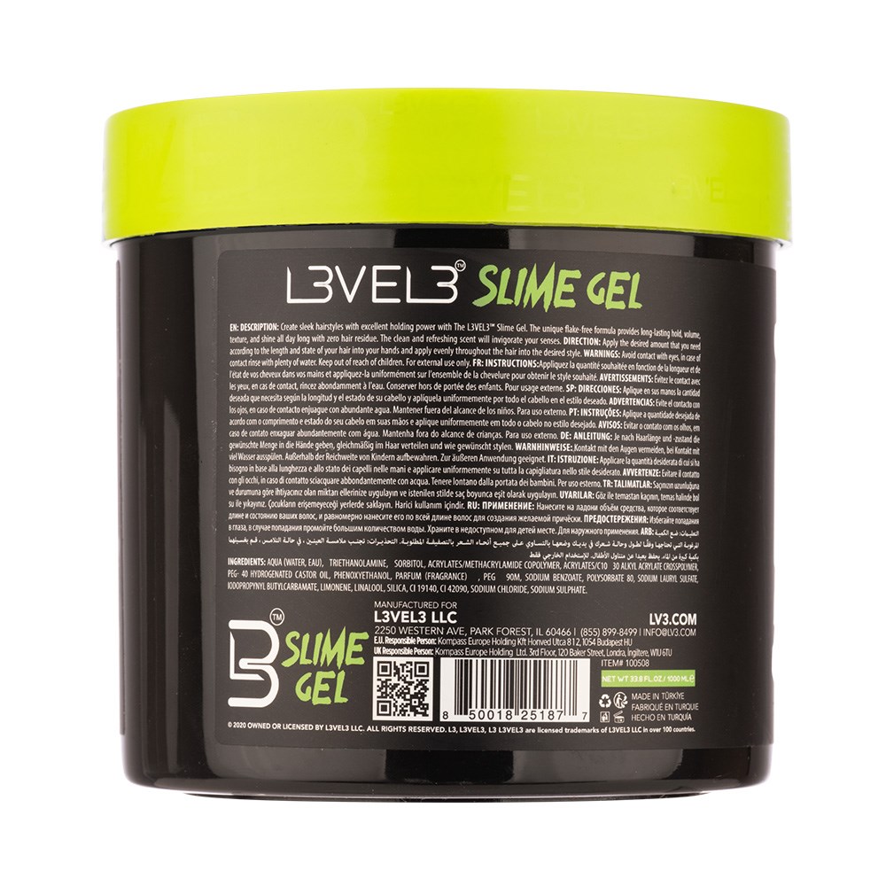 Level up. L3VEL3 Slime Hair Gel 1L Super Strong Hold elevates your styling game. This cutting-edge gel is designed to secure your style with long-lasting hold while adding shine, volume and texture. The unique gel texture allows for far easier application, creating sleek or voluminous styles with ease. Control and style flexibility you crave while also eliminating frizz. With a water-based, flake-free formula, the gel washes out effortlessly without leaving any residue, making it ideal for daily use. LEVEL 3 is by the artist for the artist, aiming to reinvent the barbering industry with high calibre products without the high price.