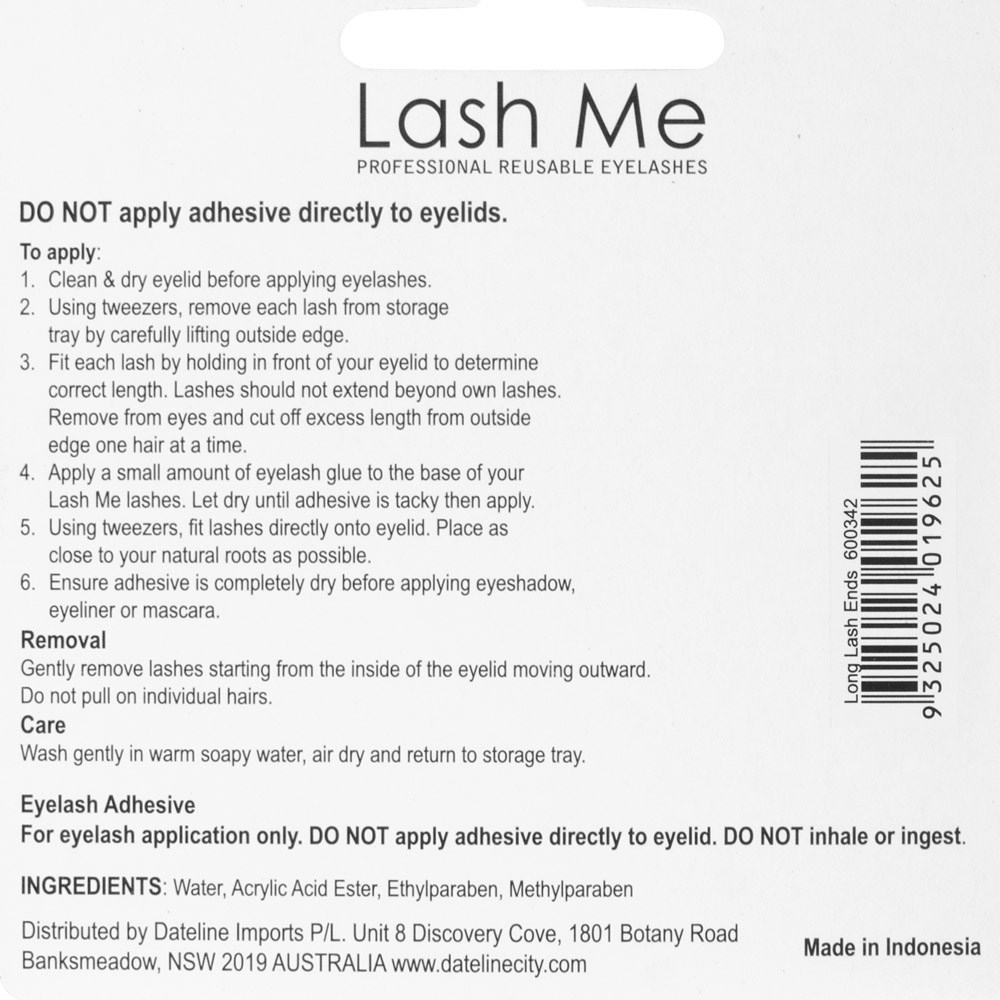 Lash Me Professional Reusable Eyelash Ends let you choose where you need extra length or volume. Select your perfect size or choose an assorted set so you have the freedom to create multiple looks without fiddling around and cutting each lash to size. Lash Me Professional grade adhesive included.