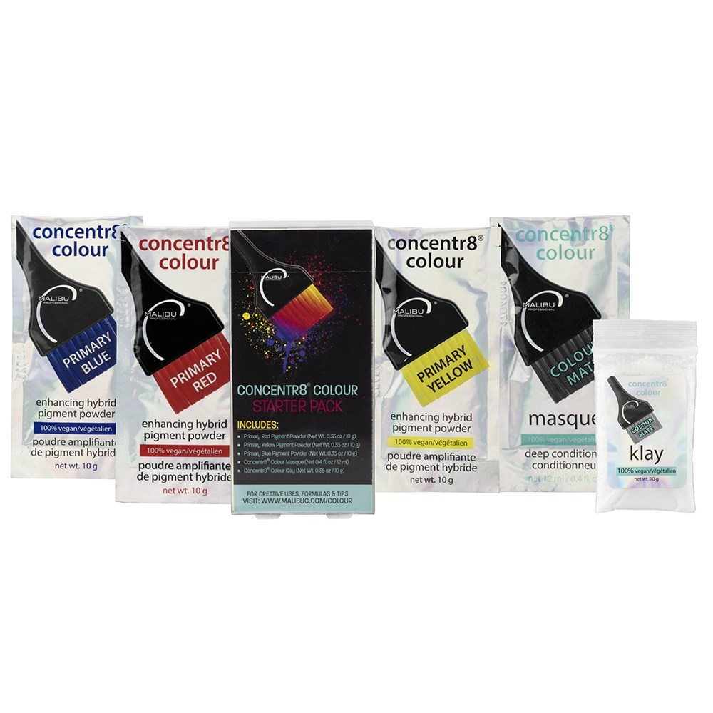 The epitome of customised hair colour. Malibu C Concentr8 Colour is colour powder pigment in three shades: Primary Red, Primary Blue and Primary Yellow. These pure powder pigments can be mixed with oxidative colour, non-oxidative colour, direct dyes, Malibu C Klay, used alone or added to any other base you choose such as shampoos, conditioners and hair masks to create custom colour for every client. If you know the colour wheel you can create anything! Like all Malibu C products, Concentr8 Colour Pigment Powders are packeted and freshly activated with water, as well as 100% vegan and formulated without gluten, ammonia and PPDs.
