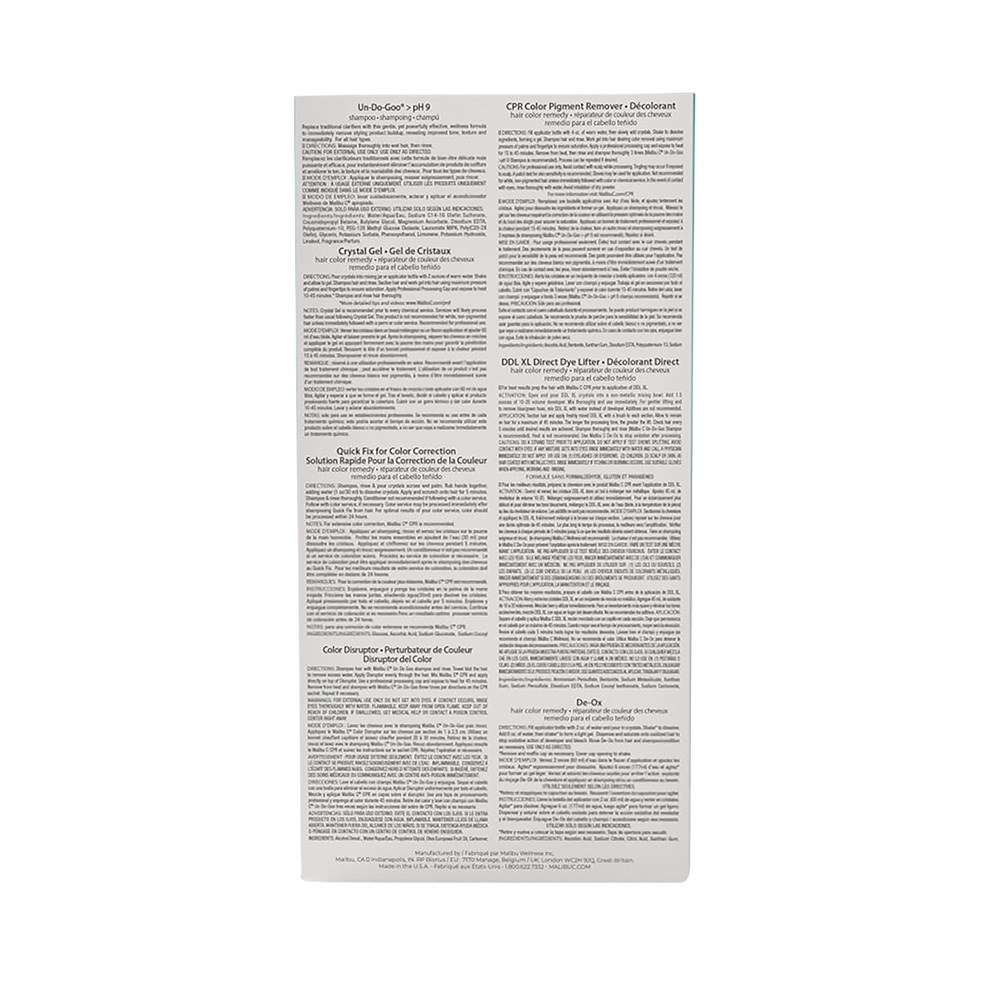 Disrupt and loosen dye with Colour Disruptor, used in conjunction with Colour Pigment Remover to eliminate up to three levels of unwanted oxidised colour. DDL XL Direct Dye Lifter effectively targets hard-to-budge direct dye pigments. Un-Do-Goo Shampoo removes product buildup and serves as the essential first step in any Malibu C salon service. Crystal Gel, Malibu C’s number one in-salon treatment, prepares the hair for all colour and chemical services by removing oxidised minerals. De-Ox stops peroxide processing and normalises porosity, while Quick Fix delivers immediate results by removing over-deposited toner within minutes at the shampoo bowl.