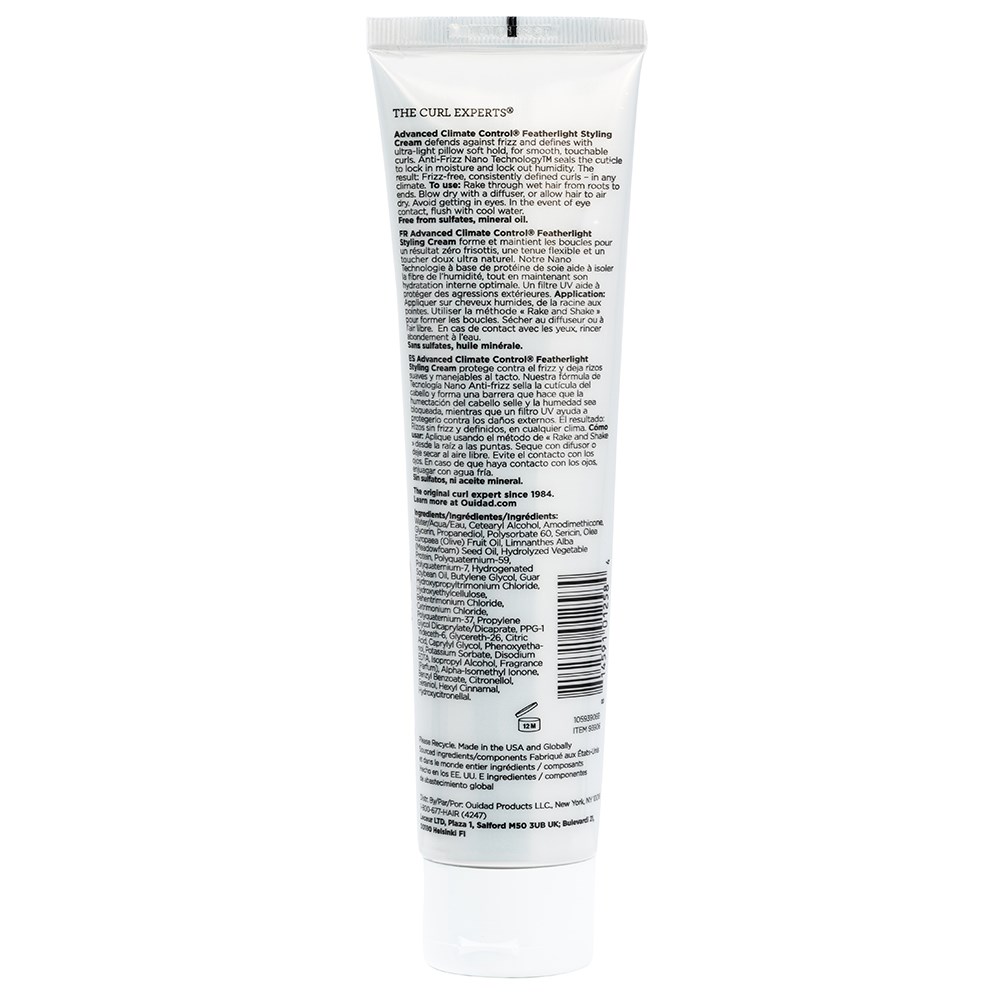 Ouidad, the original curl experts since 1984. Ouidad Advanced Climate Control Featherlight Styling Cream fights against frizz and defines with an ultra-light, pillow-soft hold. Smooth, touchable curls courtesy of Anti-Frizz Nano Technology, which harnesses silk-derived protein to seal the hair cuticle to lock out humidity. The result: Frizz-free, consistently defined curls which last – in any climate.