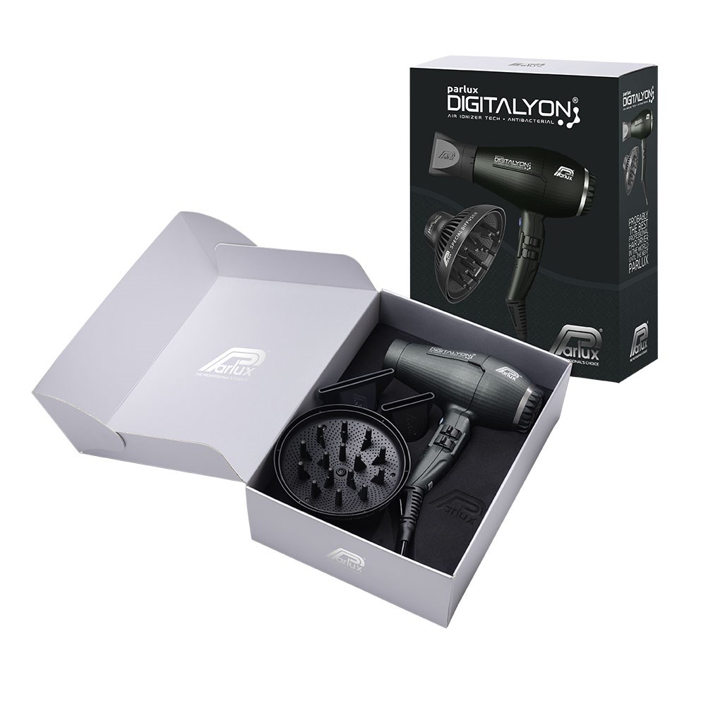 Parlux goes digital. Parlux DigitAlyon Air Ionizer Tech Antibacterial Hair Dryer and Diffuser in Anthracite (dark grey) is more powerful, more lightweight and more quiet. With the ultra-long life digital motor delivering an airflow of 88m3/h, all-day salon styling becomes a breeze. New, wave heating element with variable geometry increases power to an astounding 2400 watts. Air Ionizer Tech ionic and ceramic technology softens hair and imbues shine while speeding up drying time. Special antibacterial paint creates an unfavourable surface for the proliferation of microorganisms and helps maintain hygiene during use. Exceptionally lightweight, ergonomic and perfectly balanced. Includes Parlux MagicSense Diffuser with perfect temperature/airflow ratio.