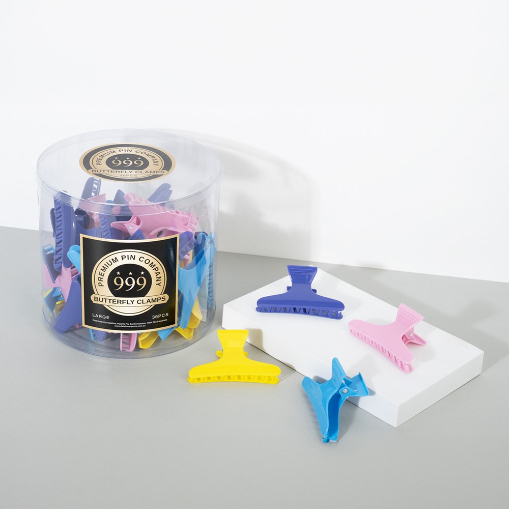 Add a pop of colour and unbeatable grip to your styling toolkit with the Premium Pin Company 999 Large Coloured Butterfly Clamps. Designed for professional use, these high-quality clamps offer a strong hold without snagging or pulling hair. Each pack includes 36 large butterfly clamps in a variety of vibrant colours, perfect for sectioning hair during cutting, colouring, blow-drying, or styling. The durable, lightweight plastic and strong tension springs ensure they stay in place, even on thick or long hair.