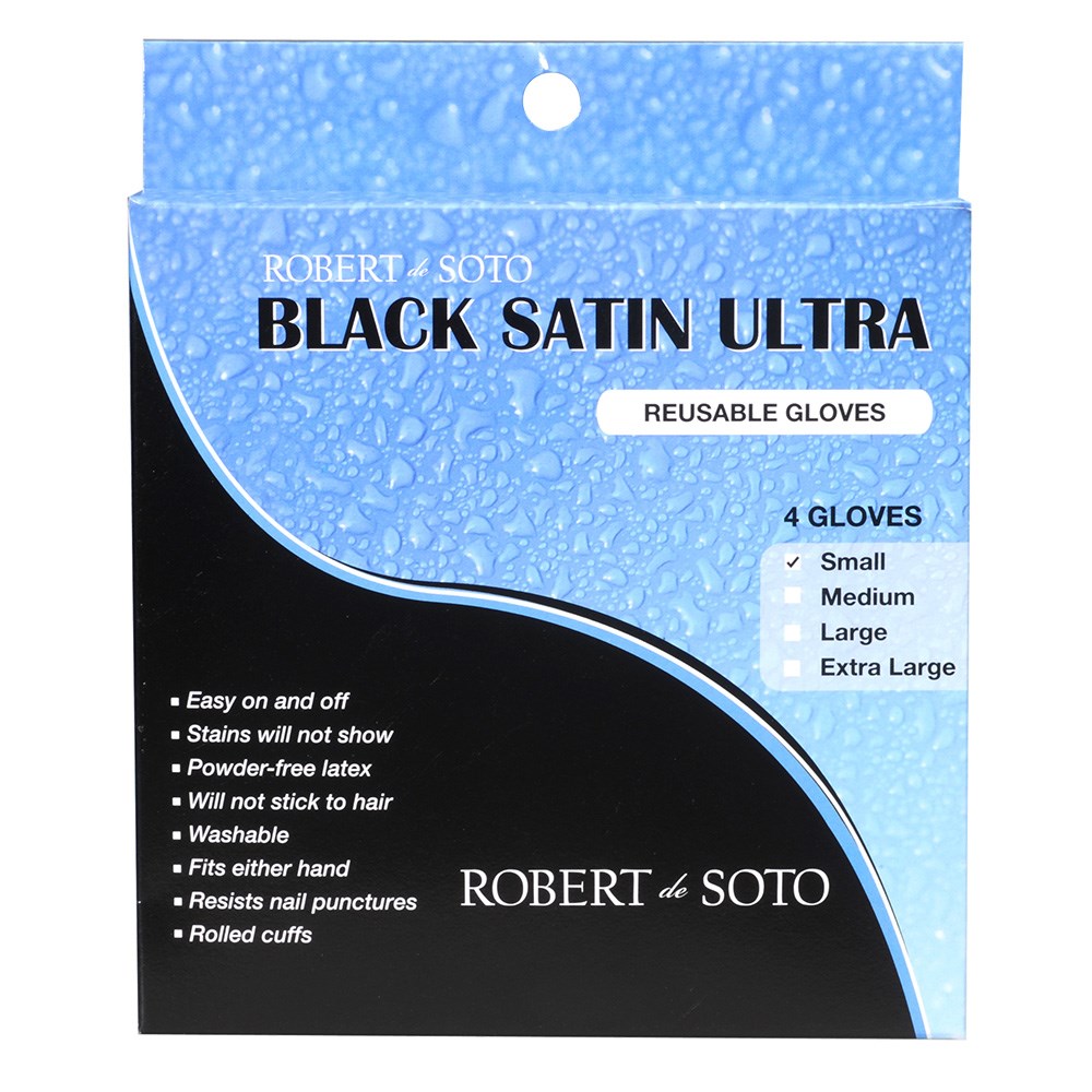 Carefree and stain-free! Easy on and easy off, Robert de Soto Black Satin Reusable Gloves are made from powder-free natural latex to protect your hands from colour stains. These comfortable, reusable gloves won’t pull or stick to the hair, and are resistant to nail punctures. Designed to fit either hand, these washable gloves are available in a pack of 4. Size: Small.