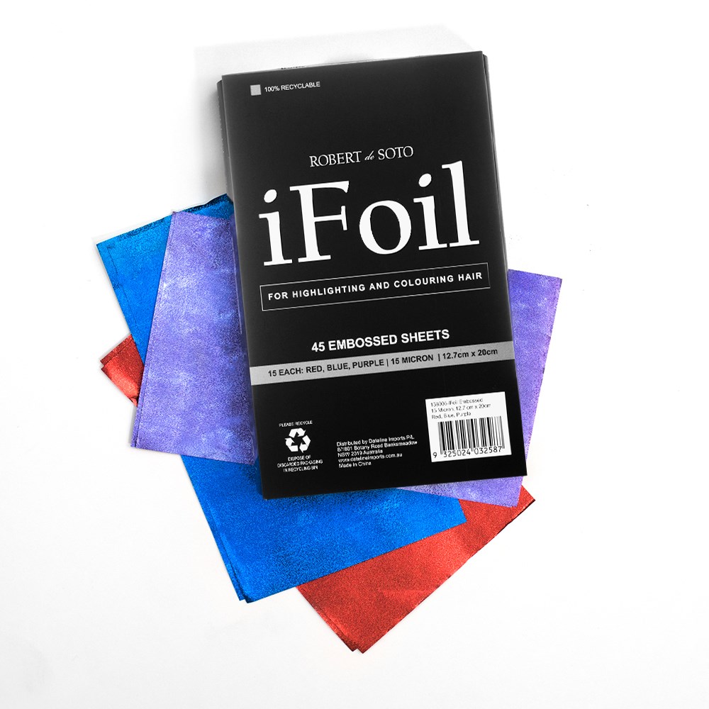 The textured surface of Robert de Soto’s Embossed Foil provides extra grip and added control. Hair will never slip during highlighting or colouring on the amazing embossed surface. Easy fold, 15 micron pre-cut sheets.