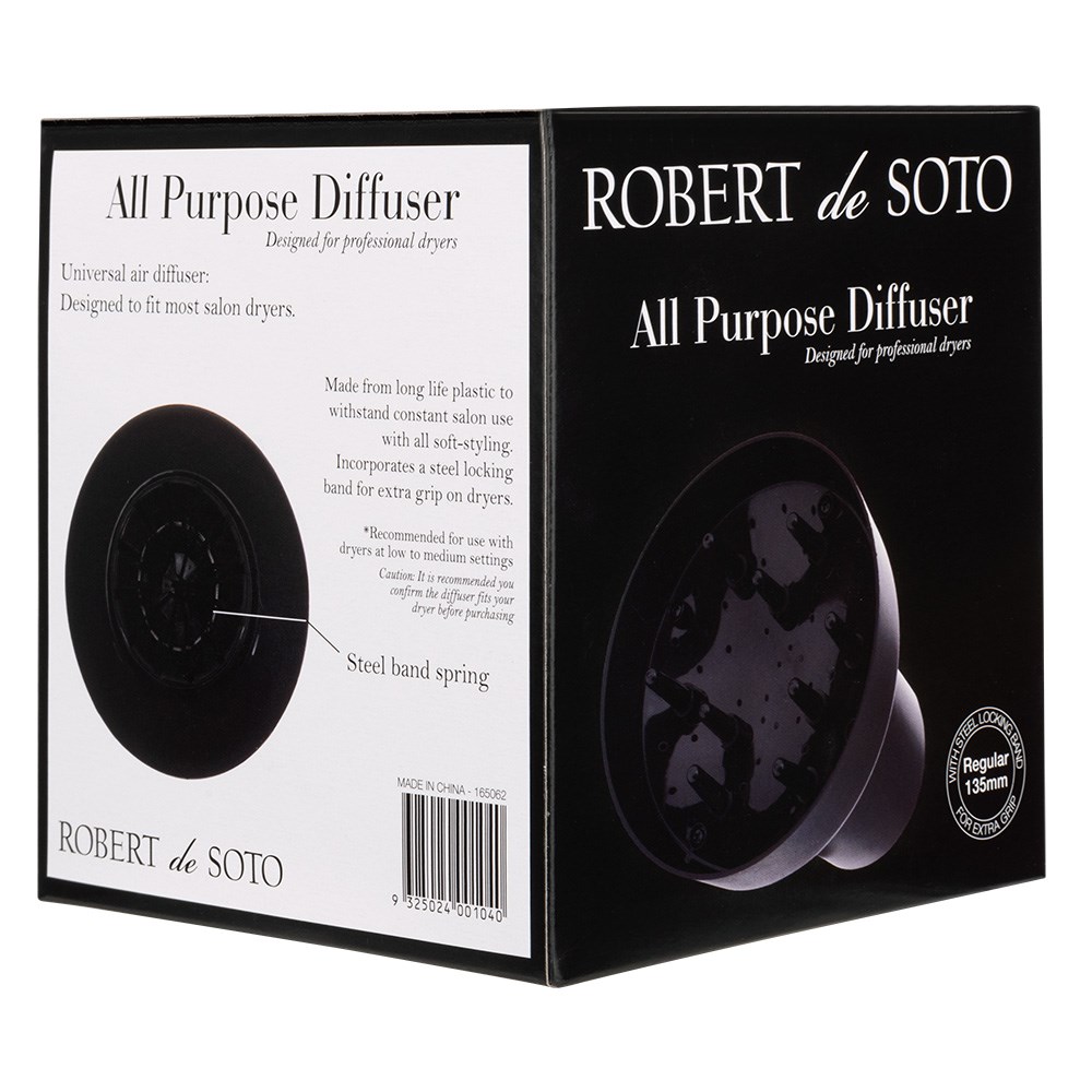 Enhance natural texture and curls without unwanted frizz. Robert de Soto Hair Dryer Finger Diffuser Regular is an all-purpose diffuser designed to fit most hair dryers. Made from long-life plastic for superior durability in a day-in, day-out salon environment, the diffuser features a steel locking band for extra grip on your hair dryer. Bring out the best in texture while enabling faster drying!