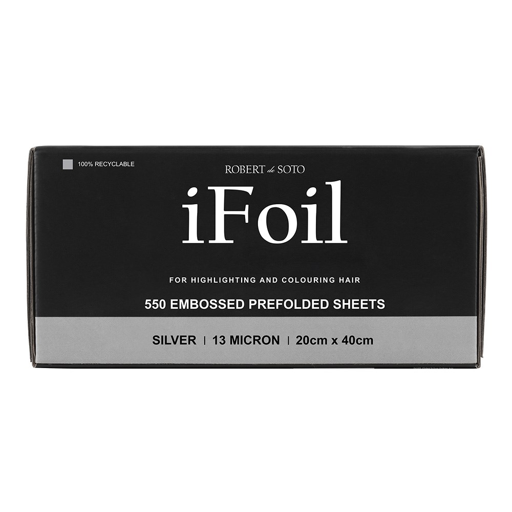 Fast and easy foil with embossing! Robert de Soto makes hairdressing foil super convenient with iFoil Embossed Pop Up 13 Micron Extra Wide Silver. This extra wide foil is great for all foiling work in the salon environment. Pre-folded sheets save precious time – simply grab a foil and get going! Foils won’t stick together or bend out of shape. Embossing on the foils grips the hair better than traditional foil, ensuring no slippage. 550 pre-folded, pop-up sheets. 100% recyclable. 13 microns and 20cm x 40cm in size.