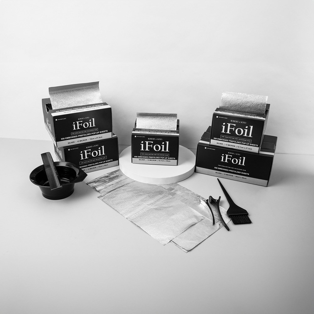 Fast and easy foil with embossing! Robert de Soto makes hairdressing foil super convenient with iFoil Embossed Pop Up 13 Micron Long Silver. This long foil is great for all foiling work in the salon environment. Pre-folded sheets save precious time – simply grab a foil and get going! Foils won’t stick together or bend out of shape. Embossing on the foils grips the hair better than traditional foil, ensuring no slippage. 550 pre-folded, pop-up sheets. 100% recyclable. 13 microns and 12.7cm x 35cm in size.