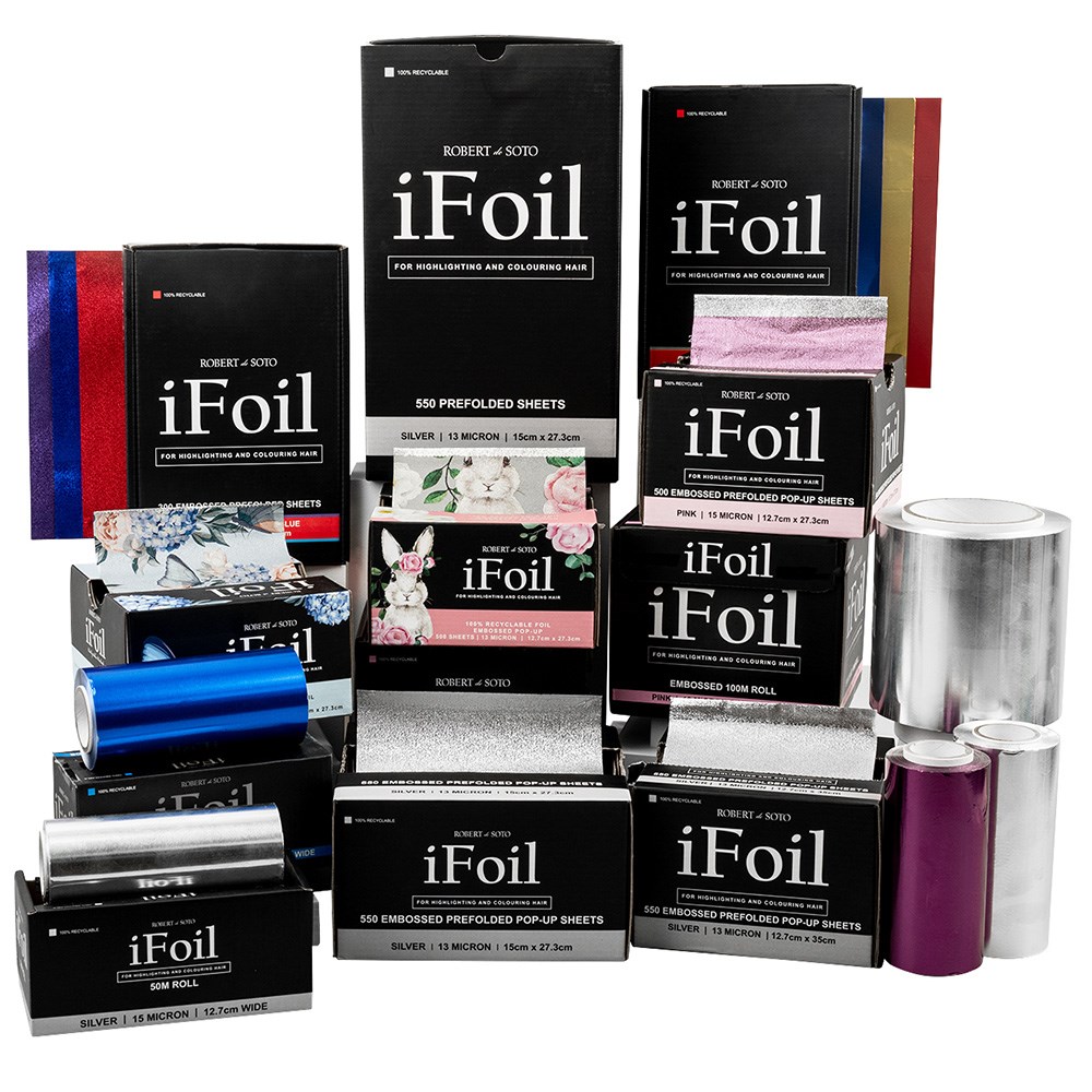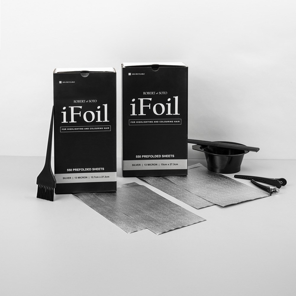 Robert de Soto’s ultimate timesaver. No need for cutting or folding, Robert de Soto iFoil Pre-Folded Foil 13 Micron Wide Silver is ready to go. This 100% recyclable hairdressing foil is pre-folded and pre-cut, eliminating all fuss. The pre-folded foil gives you extra grip and tension while 13 micron thickness offers a stable base for applying colour to sectioned hair. Wide size of 15cm x 27.3cm caters to most sectioning techniques. Robert de Soto also loves value – the box contains a generous 550 pre-folded sheets.