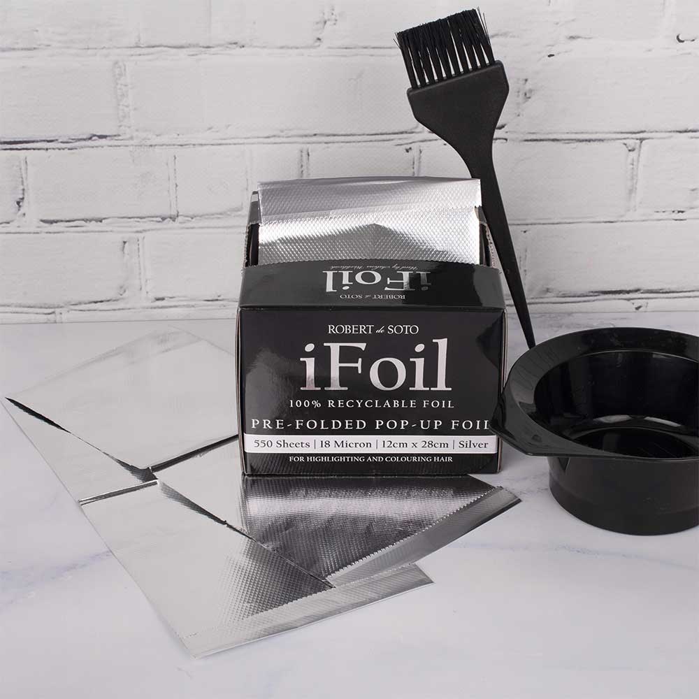 Fast and easy pre-folded hairdressing foil. Robert de Soto makes foil super convenient with his iFoil Pre-Folded Pop-Up in Silver 18 Micron. This 100% recyclable foil is all about ensuring colouring and highlighting is easy and efficient. The convenient tissue box style dispenser contains 550 pre-folded sheets of 18 microns each, designed to simply pop up. No cutting, no hassle!
