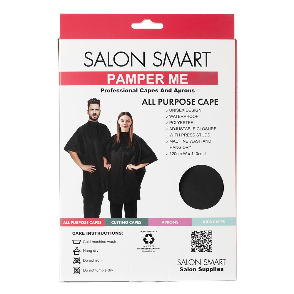 Protection in style. Salon Smart Pamper Me All Purpose Cape is a waterproof, 100% polyester cape which keeps clients comfortably protected. This lightweight, unisex design features an adjustable closure with press studs. Generous size which suits all. Machine washable.
