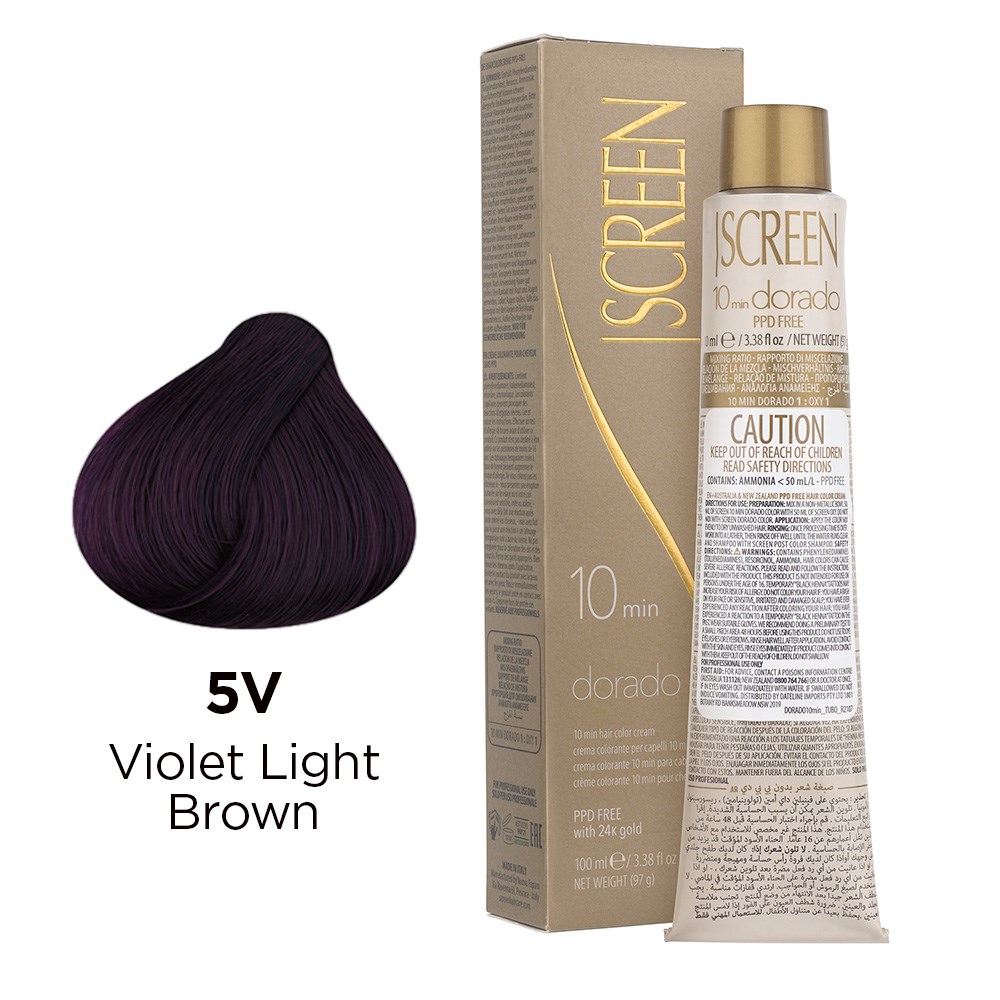 Ultra-fast, efficient and high performance, Screen 10 Min Dorado Hair Colour Cream 5V Violet Light Brown is a salon dream. With only 10 minutes processing time, this PPD-free and paraben-free colouring cream is ideal for root touch-ups, grey coverage and male clients desiring colour blending. Enriched with 24K gold for incredible light-reflecting results, vibrant shine and rich vibrancy. Maximum grey coverage and uniform, long-lasting results. Only 10 minutes to incredible colour with superb tonal richness! Elite colour created in Italy.
