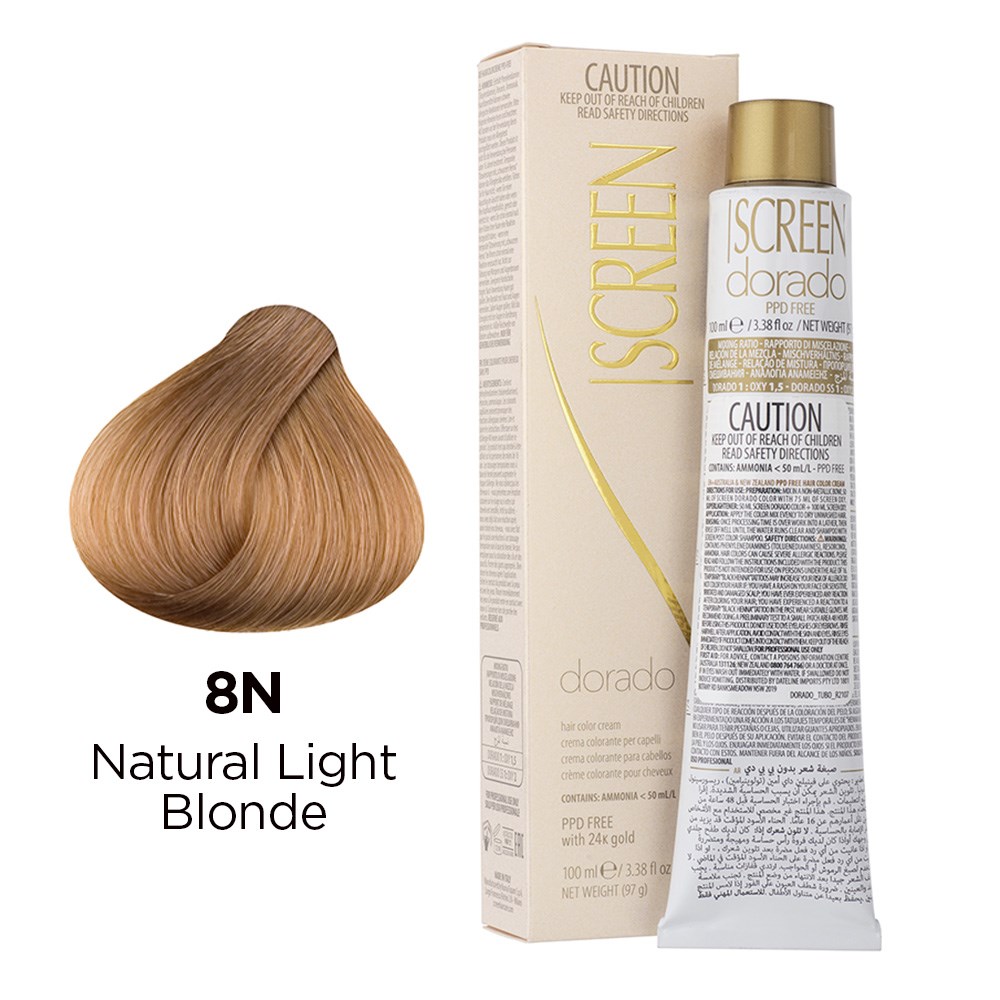 Precious cream colour with unique tonal richness. Developed in a wide range of colours, Screen Dorado Hair Colour Cream 8N Natural Light Blonde is the culmination of advanced technology, research and continuous testing. This hair colouring cream is PPD-free and enriched with 24K gold for results which are truly incredible. Microparticles of gold reflect light, multiplying the brilliance of colour. Colour is intensely rich and exceptionally long-lasting. Maximum grey coverage and balanced, uniform results. Elite colour created in Italy.